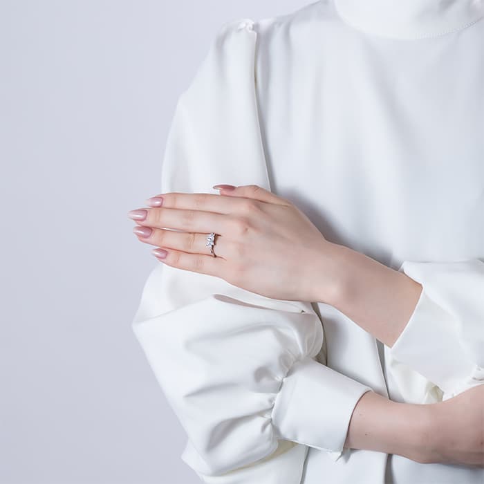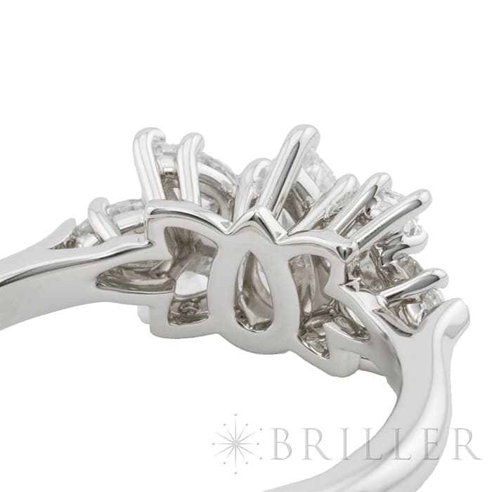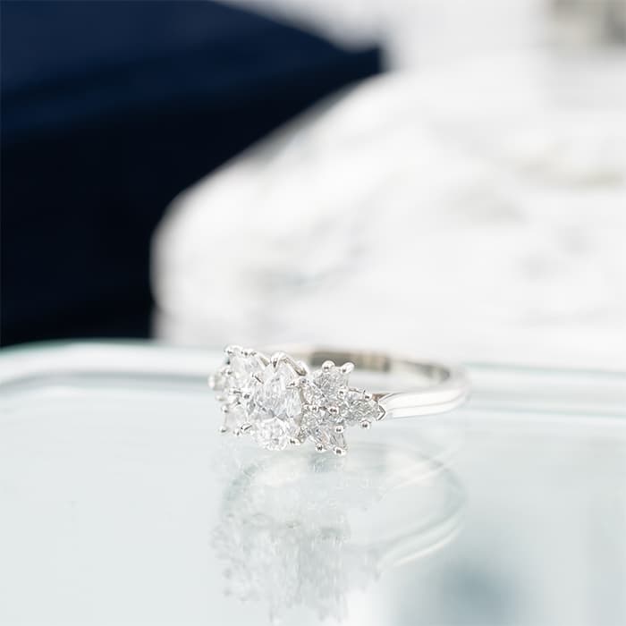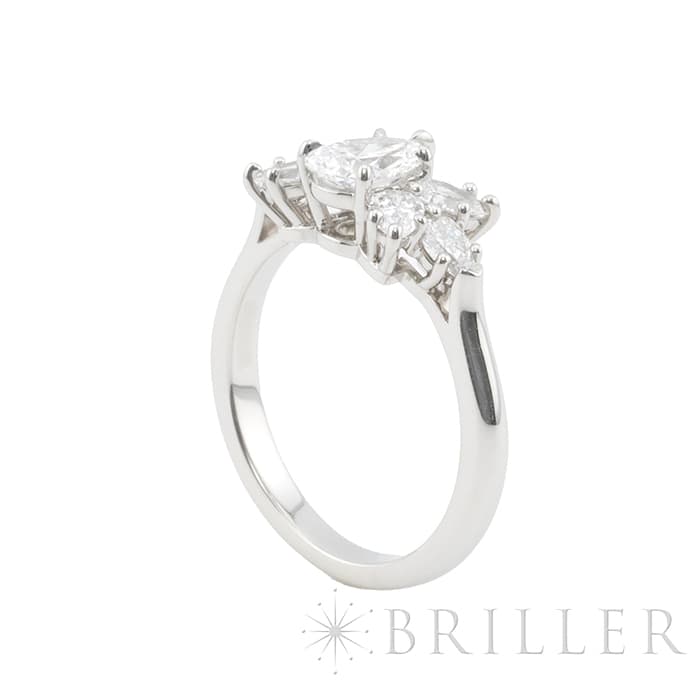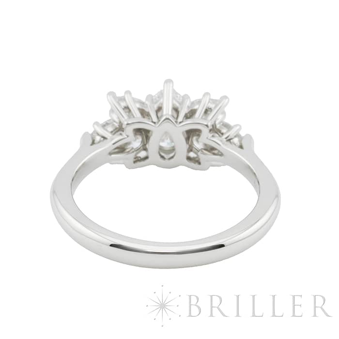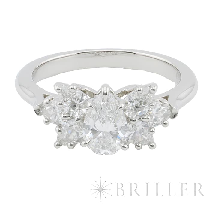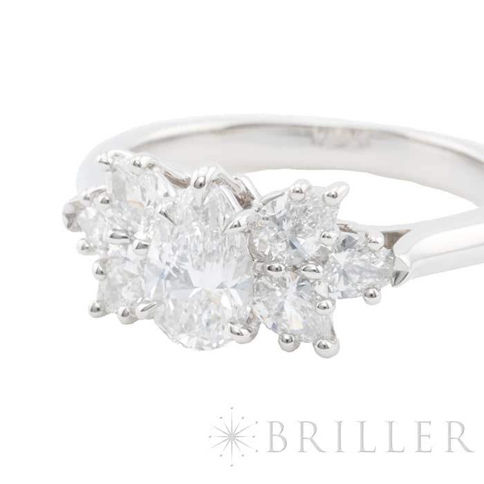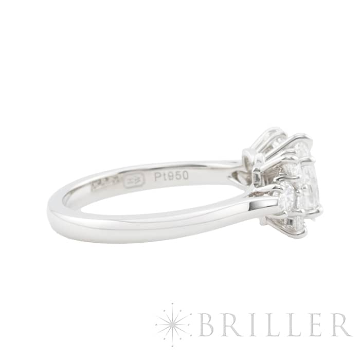 世界五大ジュエラーのひとつに数えられ、「キング・オブ・ダイヤモンド」の名を冠するハリー・ウィンストン。中でもブランドを象徴するクラスター・スタイルを採用した本リングは、圧倒的な輝きと存在感を放ちます。 中央には0.50ctのペアシェイプ・ダイヤモンドをセット。その両側を6石のペアシェイプ・ダイヤモンドが立体的に囲み、中心の輝きをより一層引き立てます。ダイヤモンドは緻密な角度でセッティングされており、あらゆる方向から光を捉えて最大限の煌めきを放ちます。 プラチナ台座は視覚的にほとんど感じさせない巧みなセッティングにより、まるでダイヤモンドだけが宙に浮かんでいるかのような軽やかでラグジュアリーな印象を実現。センターストーンはカラーグレード「E」、クラリティ「VVS1」という極めて高品質なものを使用し、世界最高峰のジュエラーならではの卓越した美しさを堪能できます。 ハリー・ウィンストンが誇る伝統とクラフトマンシップが結晶した、永遠の輝きを纏う特別な一本です。