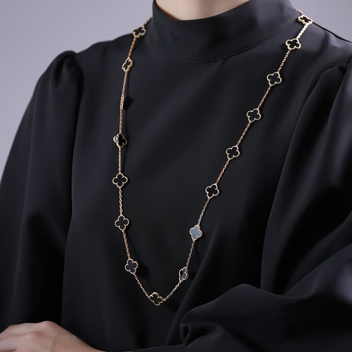 1902年にパリのヴァンドーム広場から始まった世界5大ブランドの1つ、ヴァンクリーフ&アーペル。ヴァンクリーフ&アーペルの象徴とも言える、幸運の象徴の四つ葉のクローバーをデザインした「アルハンブラ」コレクション。 ロングネックレスのこちらは、20個ものアルハンブラモチーフが使用されており、どこから見てもアルハンブラが存在感たっぷりに、コーディネートに華やかさと可愛らしさをプラスします。2連にして着ければ、格別のラグジュアリーな雰囲気を楽しめます。