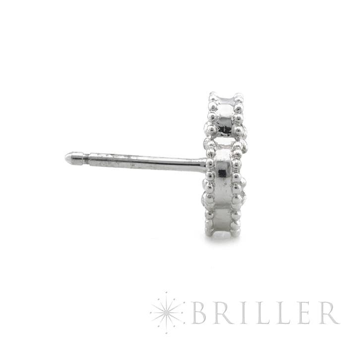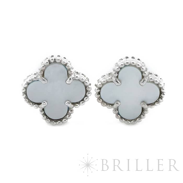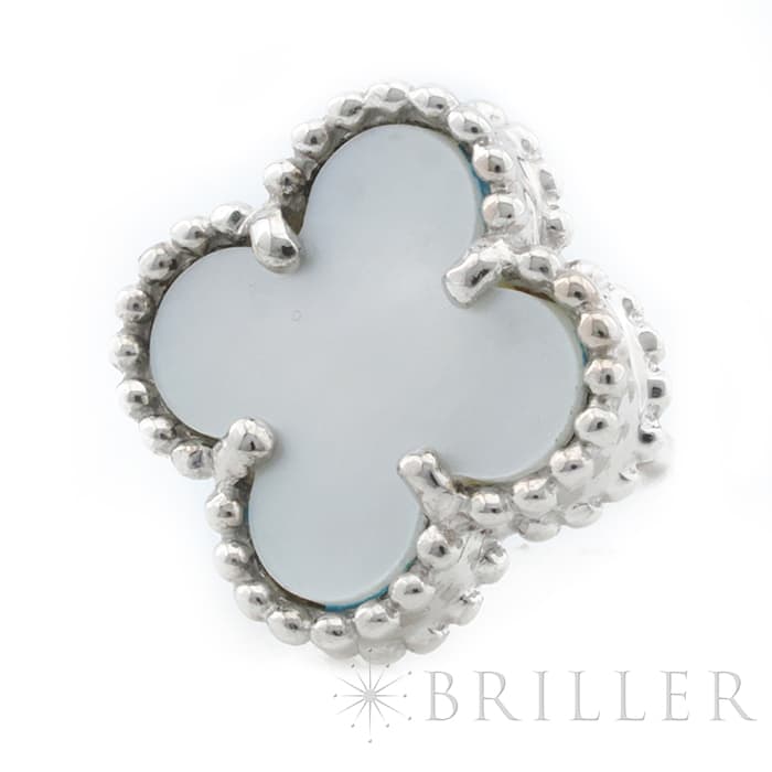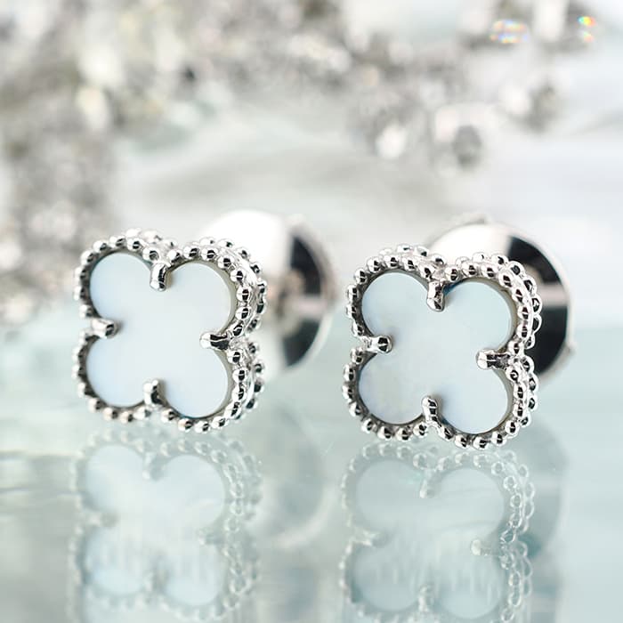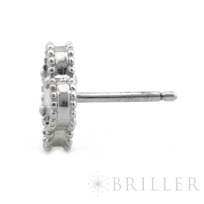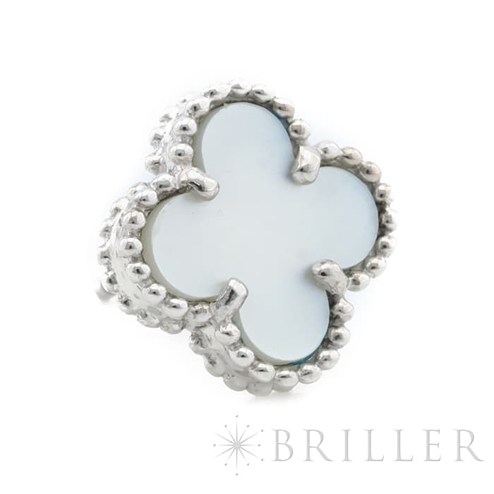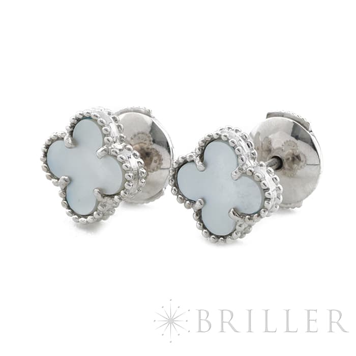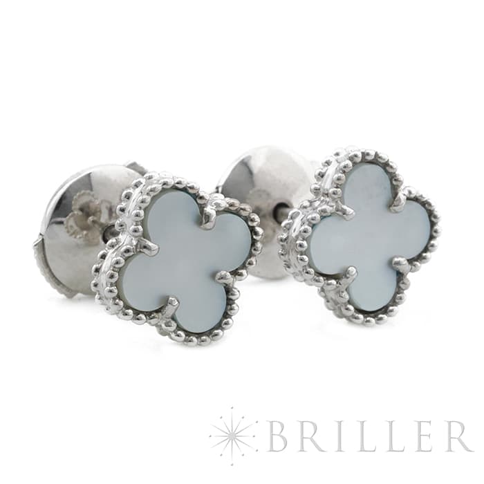 フランスに本店のある宝石、時計、香水を扱うハイジュエラー「ヴァンクリーフ&アーペル」。 1906年に誕生し、数多くのセレブリティから愛されているブランドとなります。 定番モデル「アルハンブラ」には複数のサイズ展開があり、こちらは「 スウィート アルハンブラ」と呼ばれる最も小さく可愛らしいモチーフです。 ホワイトゴールド素材にマザー オブ パールが大変上品で美しいピアスです。