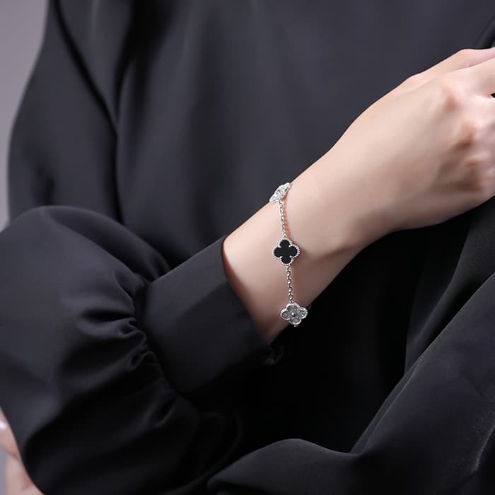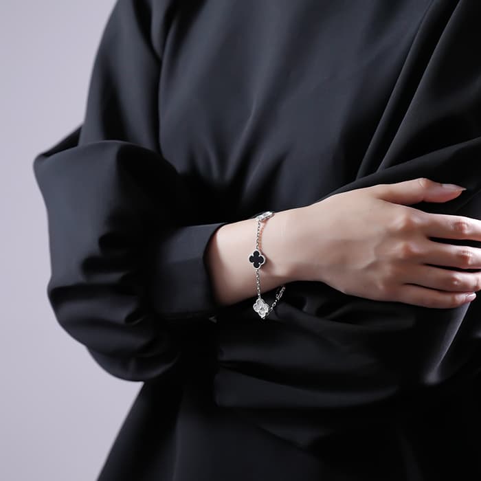 フランスに本店のある宝石、時計、香水を扱うハイジュエラー「ヴァンクリーフ&アーペル」。1906年に誕生し、数多くのセレブリティから愛されているブランドです。その代表作ともいえる「アルハンブラ」コレクションは、四つ葉のクローバーを象った幸運のモチーフで知られ、時代を超えて愛される名品です。複数のサイズ展開があり、こちらは「 ヴィンテージ アルハンブラ」と呼ばれる最もベーシックなモチーフです。 ホワイトゴールドの上品な光沢に、ブラックオニキスとダイヤモンドモチーフがセッティングされおり、動くたびにきらめきを放ち、女性らしい手元をエレガントに演出してくれます。シンプルでありながら確かな個性を放つデザインは、日常の装いから特別なシーンまで幅広く活躍し、ヴァンクリーフ&アーペルならではの気品と華やかさを存分に楽しめる逸品です。