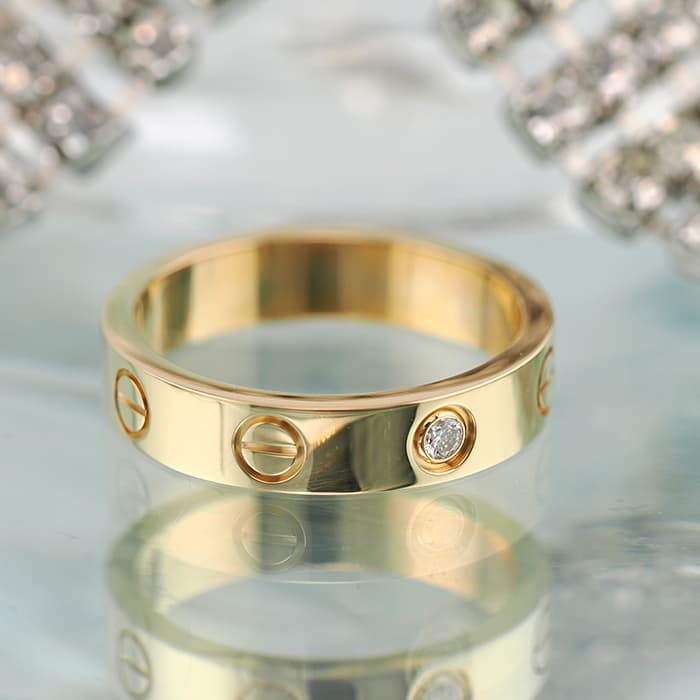 世界5大ジュエラーとして世界中から愛されるブランド「カルティエ」。カルティエが手掛ける「束縛」や「愛の絆」をテーマにして作られた「ラブコレクション」は、老若男女問わず不動の人気を博しています。その中でも、「愛を閉じ込める」という意味のビスマークが刻印された「ラブリング」は、ペアリングとして購入される方も非常に多い人気ラインです。ダイヤモンドをポイント使いしているこちらのリングには華やかなイエローゴールドを使用しており、上品かつゴージャスにお手元を彩ります。