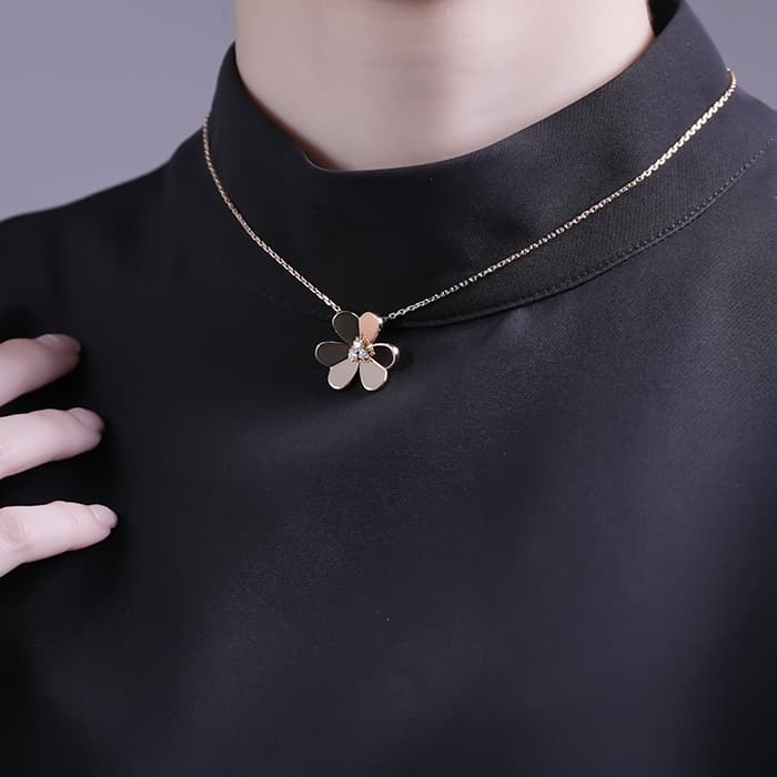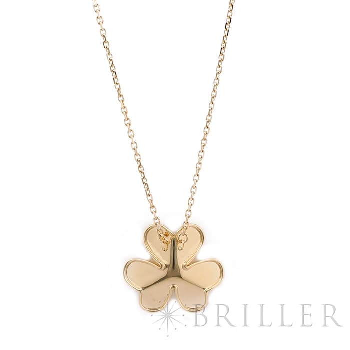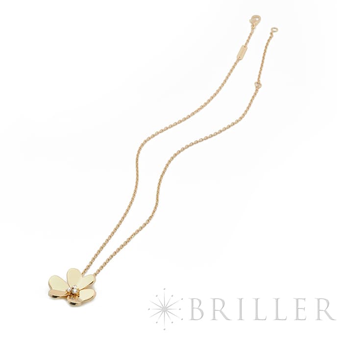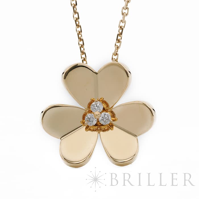 フランスに本店のあるハイジュエラー「ヴァンクリーフ&アーペル」。1906年に誕生し、数多くのセレブリティから愛されているブランドです。代表モデルの一つ「フリヴォル」コレクション。今ではアルハンブラと並びヴァンクリーフ&アーペルの代表コレクションの一つとして高い人気を誇ります。そよ風にゆれる花々からインスピレーションを得ており、立体的な花のモチーフが愛らしいです。こちらはイエローゴールドの中央にダイヤモンドをセッティング。華奢ながらも可愛らしいデザインです。