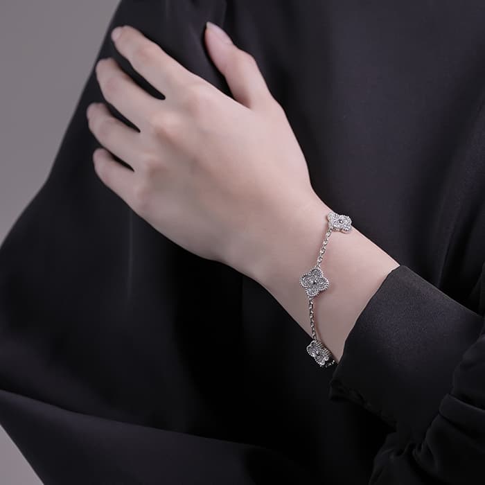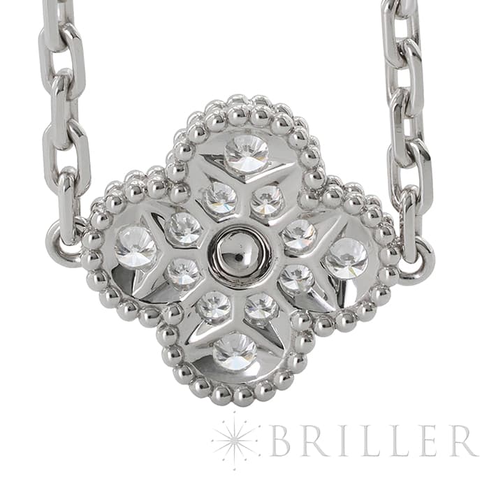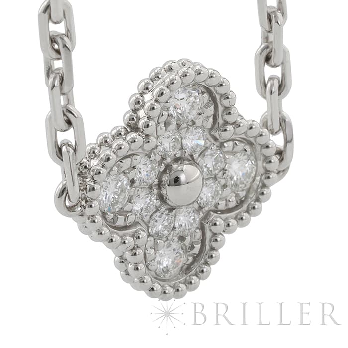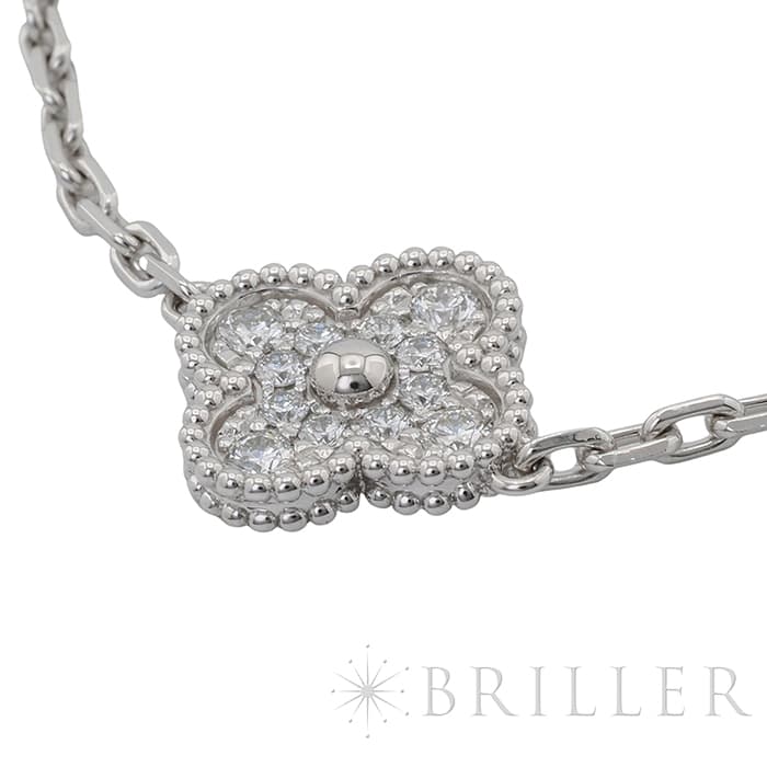 フランスに本店のある宝石、時計、香水を扱うハイジュエラー「ヴァンクリーフ&アーペル」。1906年に誕生し、数多くのセレブリティから愛されているブランドです。定番モデル「アルハンブラ」には複数のサイズ展開があり、こちらは「 ヴィンテージ アルハンブラ」と呼ばれる最もベーシックなモチーフです。 ホワイトゴールドの輝きにダイヤモンドが映える、上品で美しいブレスレットです。
