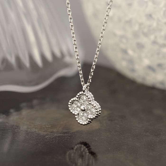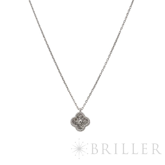フランスに本店のある宝石、時計、香水を扱うハイジュエラー「ヴァンクリーフ&アーペル」。 1906年に誕生し、数多くのセレブリティから愛されているブランドとなります。 定番モデル「アルハンブラ」には複数のサイズ展開があり、こちらは「 スウィート アルハンブラ」と呼ばれる最小さく可愛らしいモチーフです。ペンダントには12 石のラウンドカット ダイヤモンドがセッティングされ、輝きを放ちます。