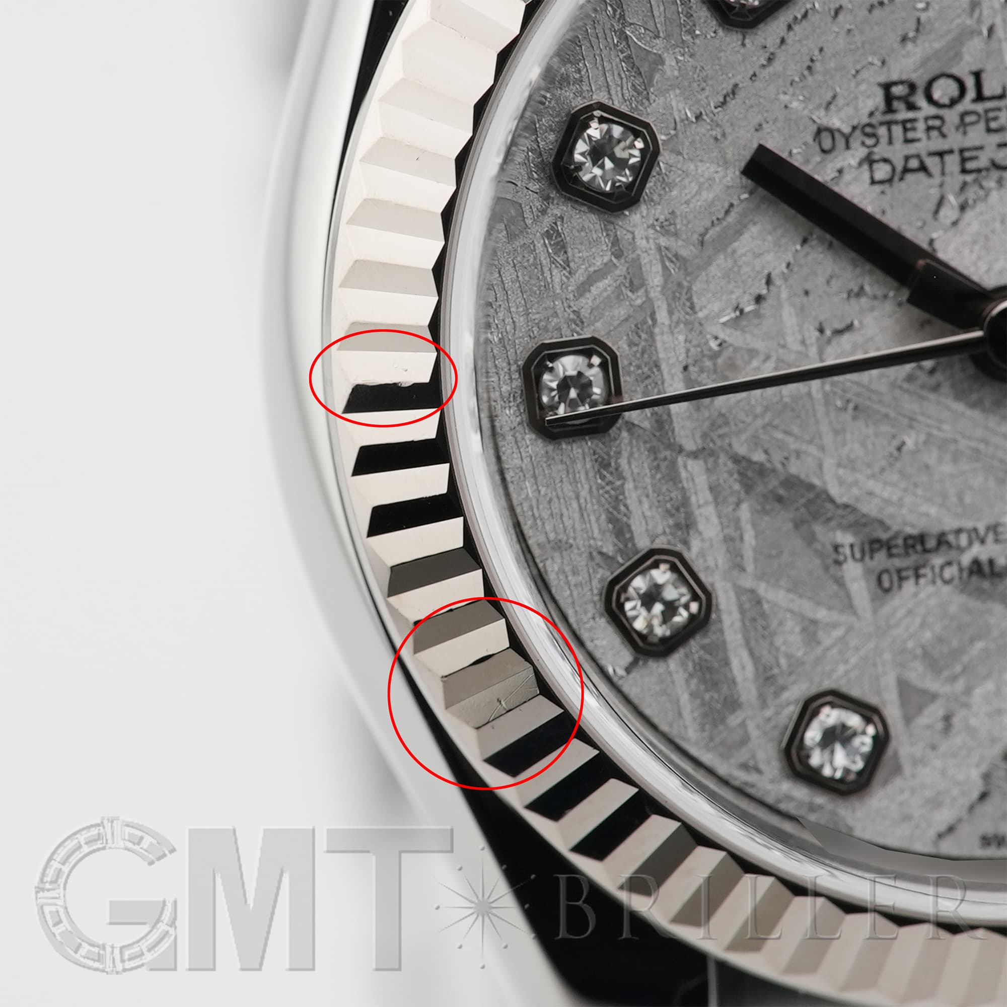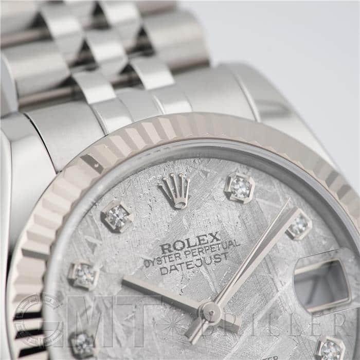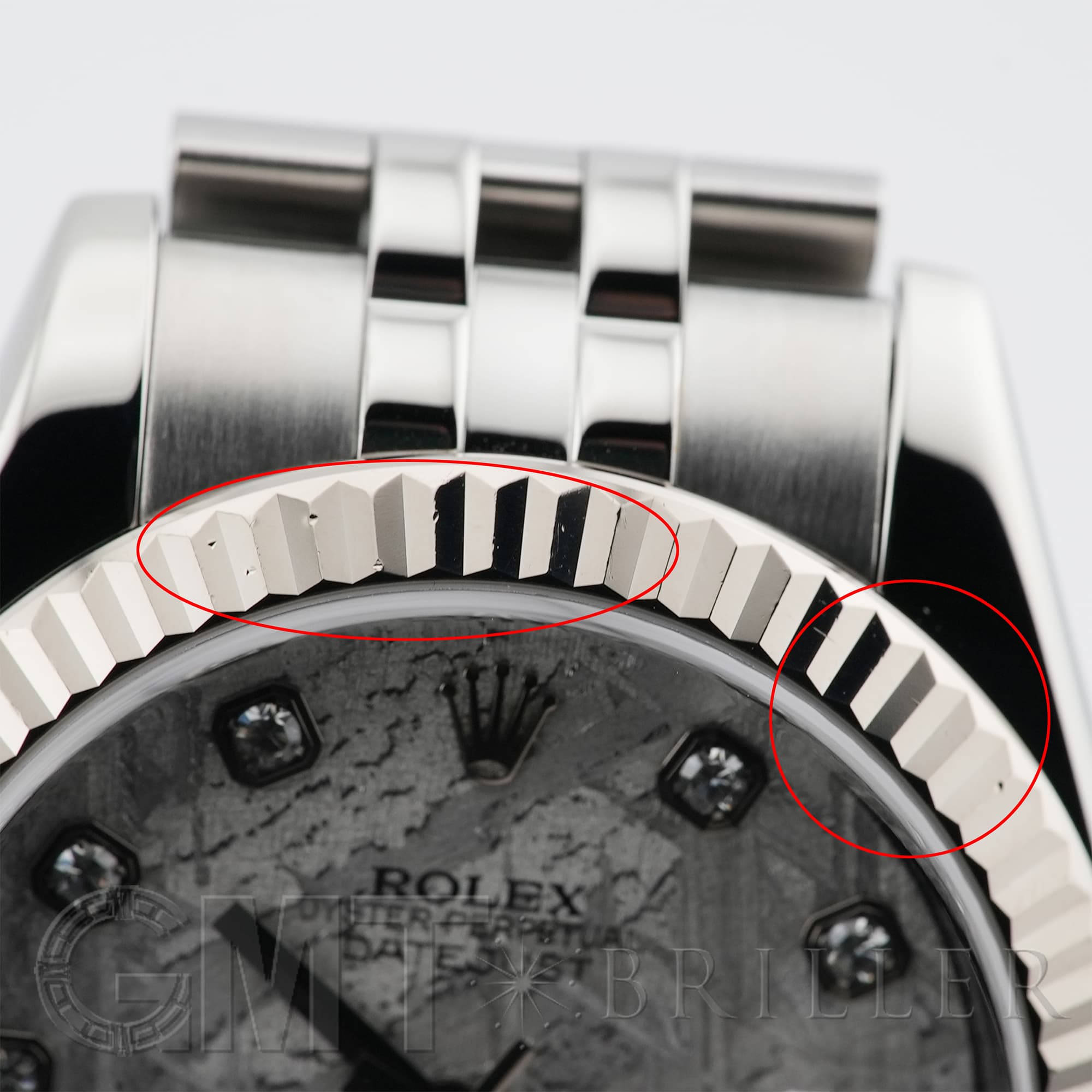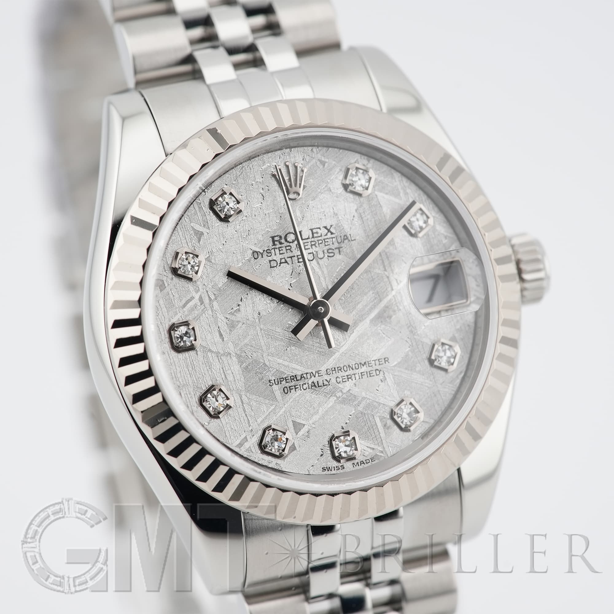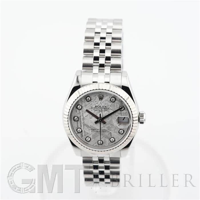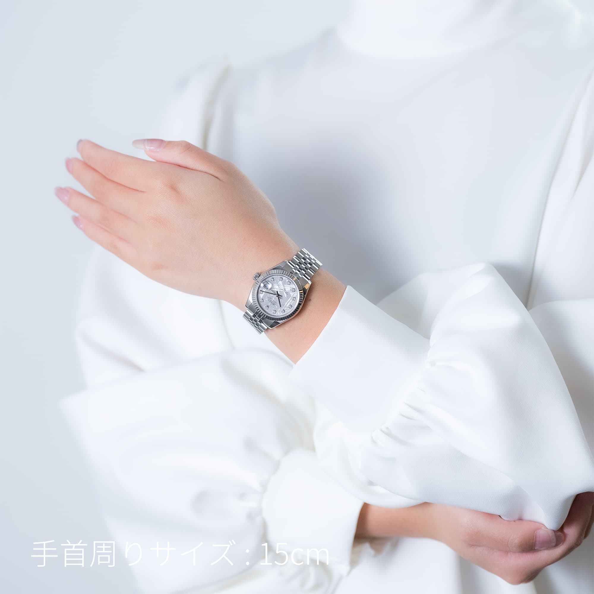 ロレックス デイトジャスト 178274G メテオライト ROLEX ロレックスの3大発明「デイトジャスト機構」「オイスターケース」「パーペチュアル機構」 を搭載したデイトジャスト。 数ある文字盤バリエーションの中でもひときわ特別感のある『メテオライト(隕石)』は個体によって全く異なる表情を見せる繊細な文字盤です。 この個体は特に石の模様が大きくはっきりとしており、キラキラとした風合いが際立っています。 少し大きめの31mmケース、ダイヤルに10ポイントダイヤ、ベゼルにはホワイトゴールドを使用し、 シンプルな色味でありながらラグジュアリーな雰囲気も持ち合わせたデザインで、日常から特別なシーンまで上品な存在感を演出いたします。 保証書日付 2011年2月(シリアル V番) 2025年11月 提携修理会社にてオーバーホール、外装仕上げ済み ベゼル、ラグ裏に傷・打痕がございます。 当社の中古品はインターネットでも安心してご購入頂けるよう、しっかりとした点検整備を行っております。ロレックス 買取り・下取りも行っておりますので、お気軽にご相談ください。