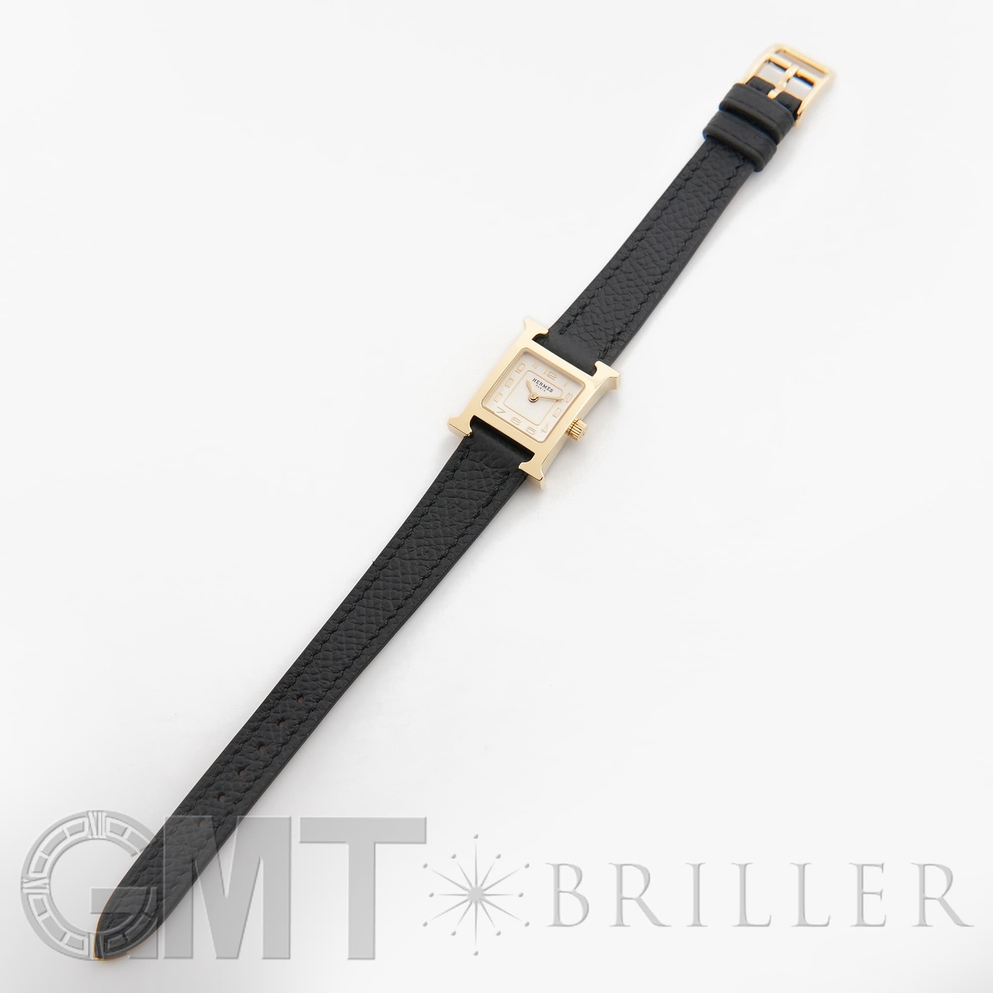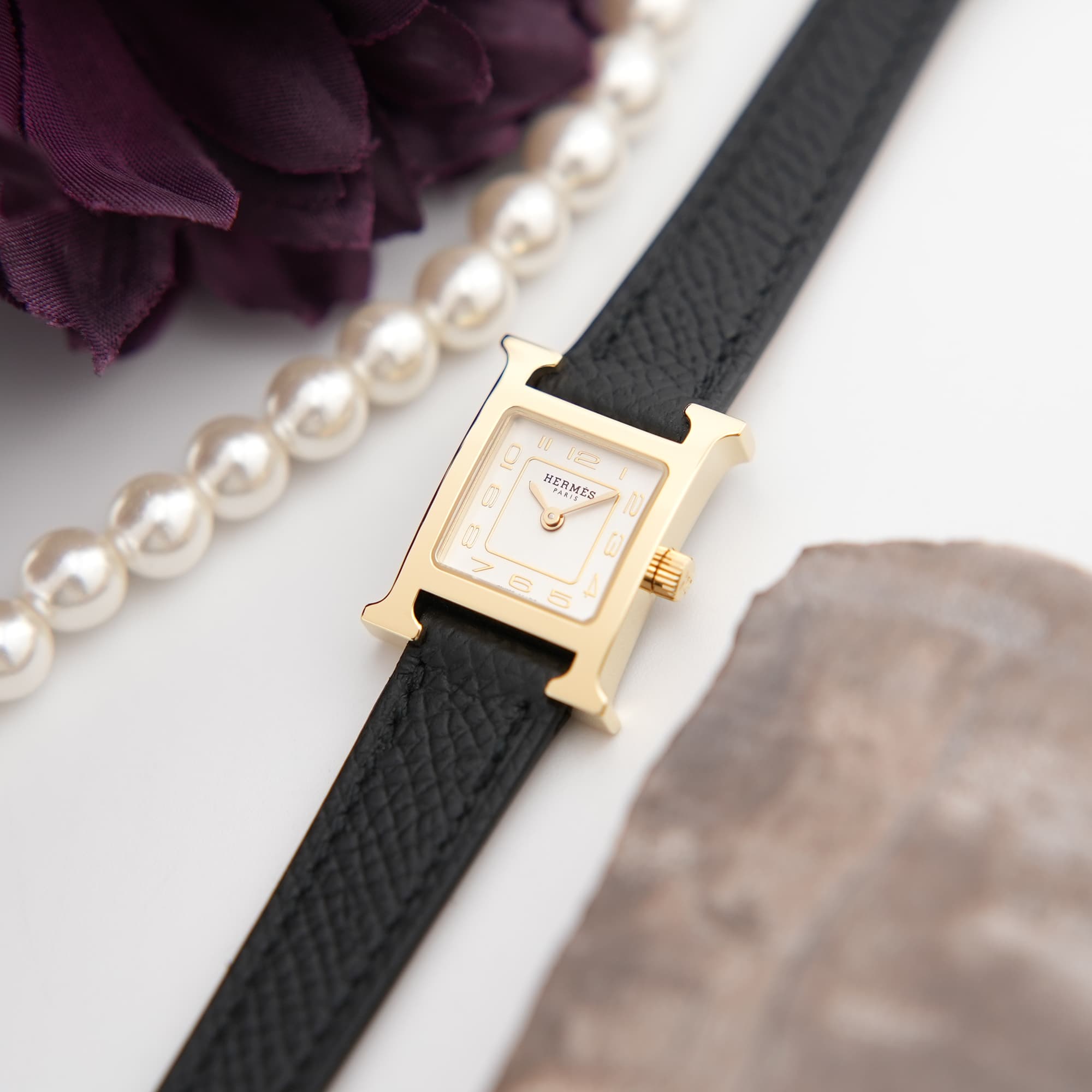 エルメス Hウォッチ ミニ 21mm ノワール HH1.101.229 HERMES【未使用】1837年に高級馬具メーカーとして始まり、世界最高峰の革製品ブランドとして、世界中のセレブリティに愛され続けるエルメス。1996年の誕生以来、ブランドの頭文字「H」をモチーフにした「Hウォッチ」は、エルメス時計の中でも人気を集めるアイコンウォッチです。特徴的な「H」型のケースにシンプルな文字盤、そして世界が認めるエルメスの革職人によって製作される最上級のレザーストラップがこの時計の魅力となっています。保証書日付 2025年10月【未使用品】※コンディションにつきまして、こちらは使用されていない「未使用」状態です。エルメス 時計の買取り・下取りも行っておりますので、お気軽にご相談ください。