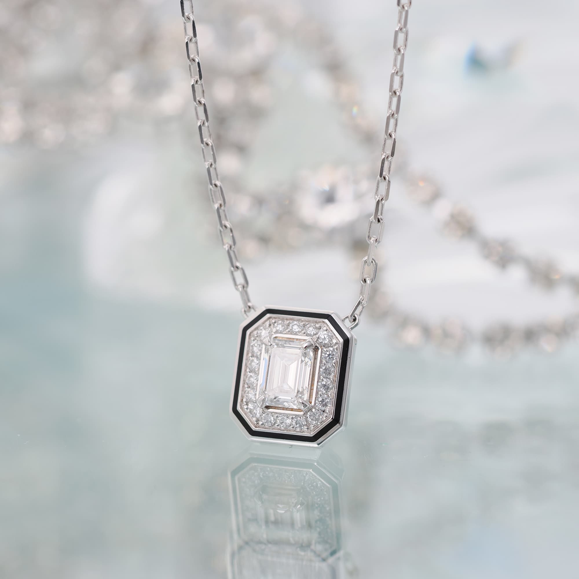 ハイジュエリーコレクション「リズレ」を現代的に再解釈した、ヴァンドーム リズレ。ブシュロンゆかりの地、パリ・ヴァンドーム広場を俯瞰した八角形のフォルムを宿し、エメラルドカットのダイヤモンドを縁取るブラックラッカーのラインが、アールデコの幾何学美を際立たせます。建築様式に着想を得たブシュロンならではのタイムレスな世界観を象徴する一作で、石畳や円柱、八角形のモチーフが織り成すパリの洗練をペンダントトップに凝縮。気品と存在感をそなえ、日常にもドレスシーンにも凛とした輝きを添えるジュエリーです。