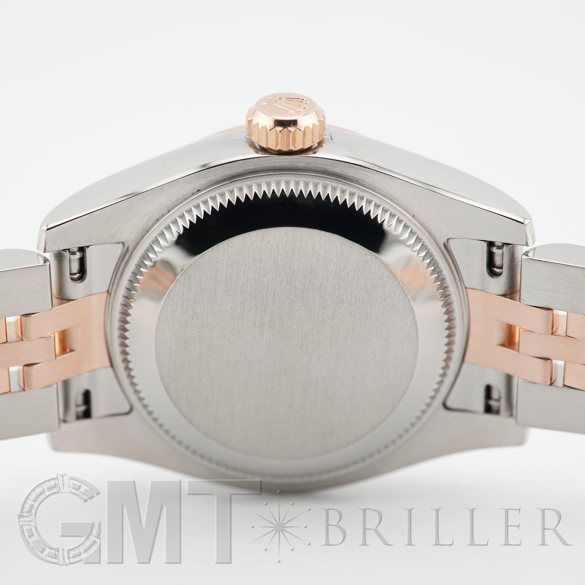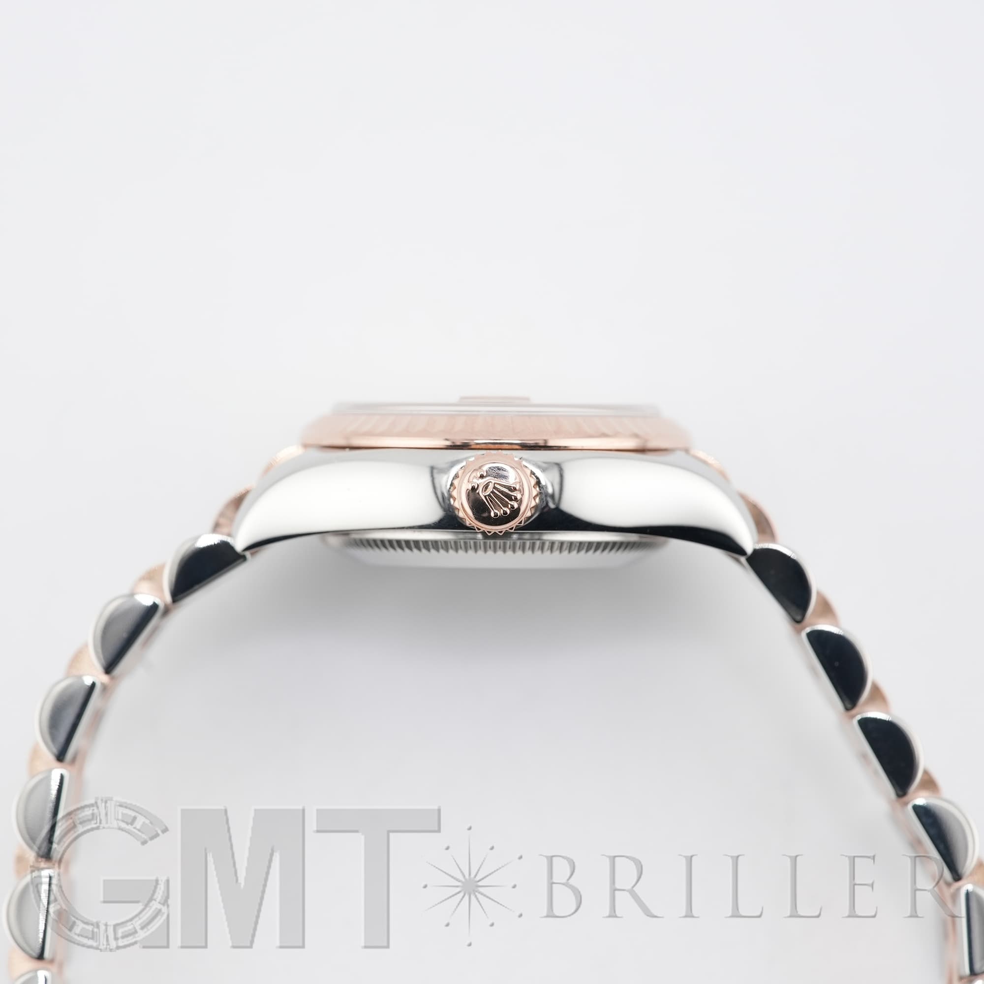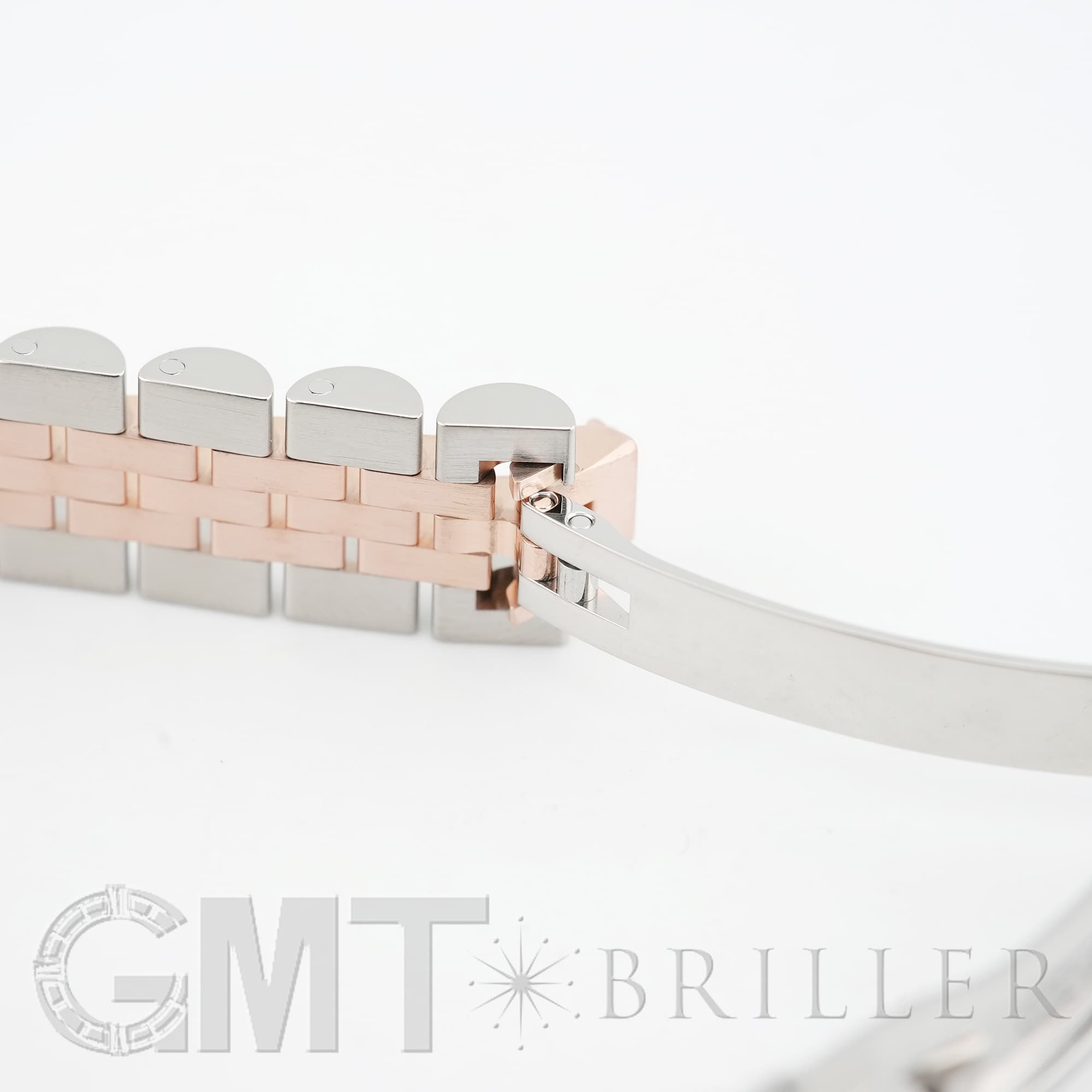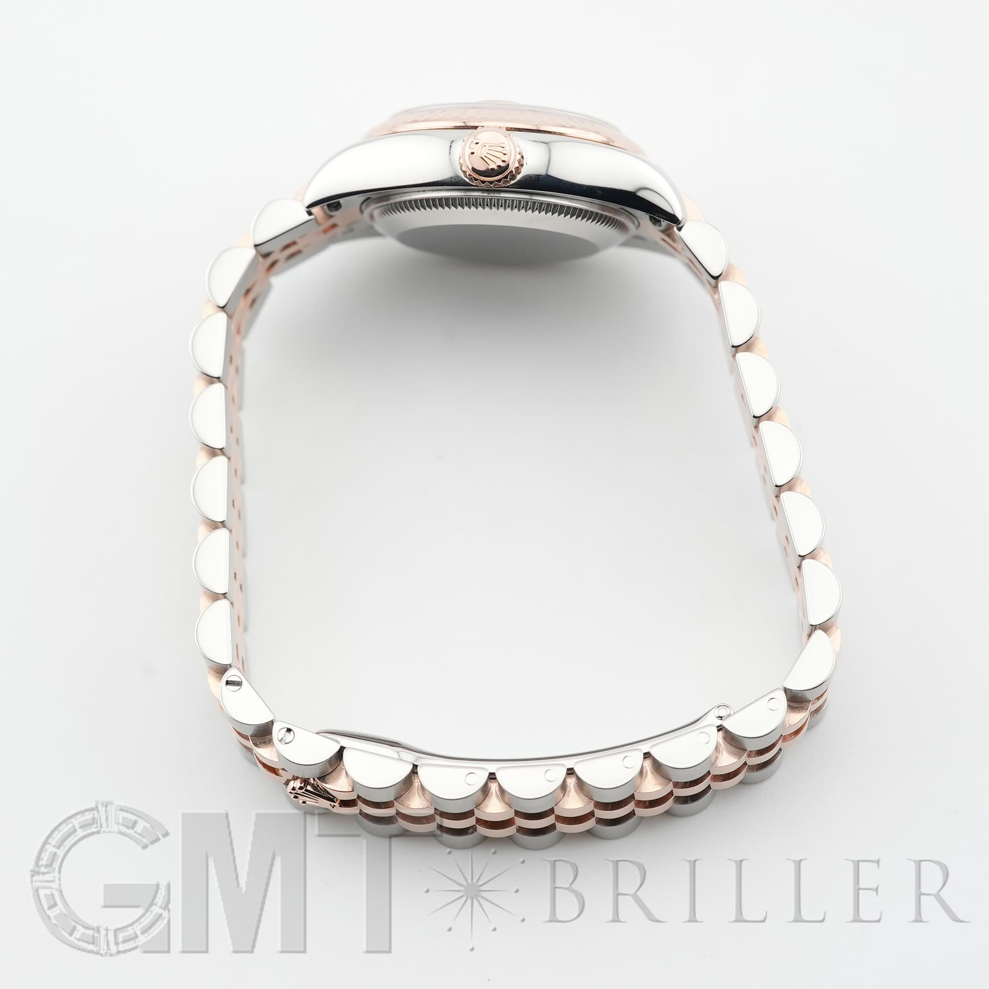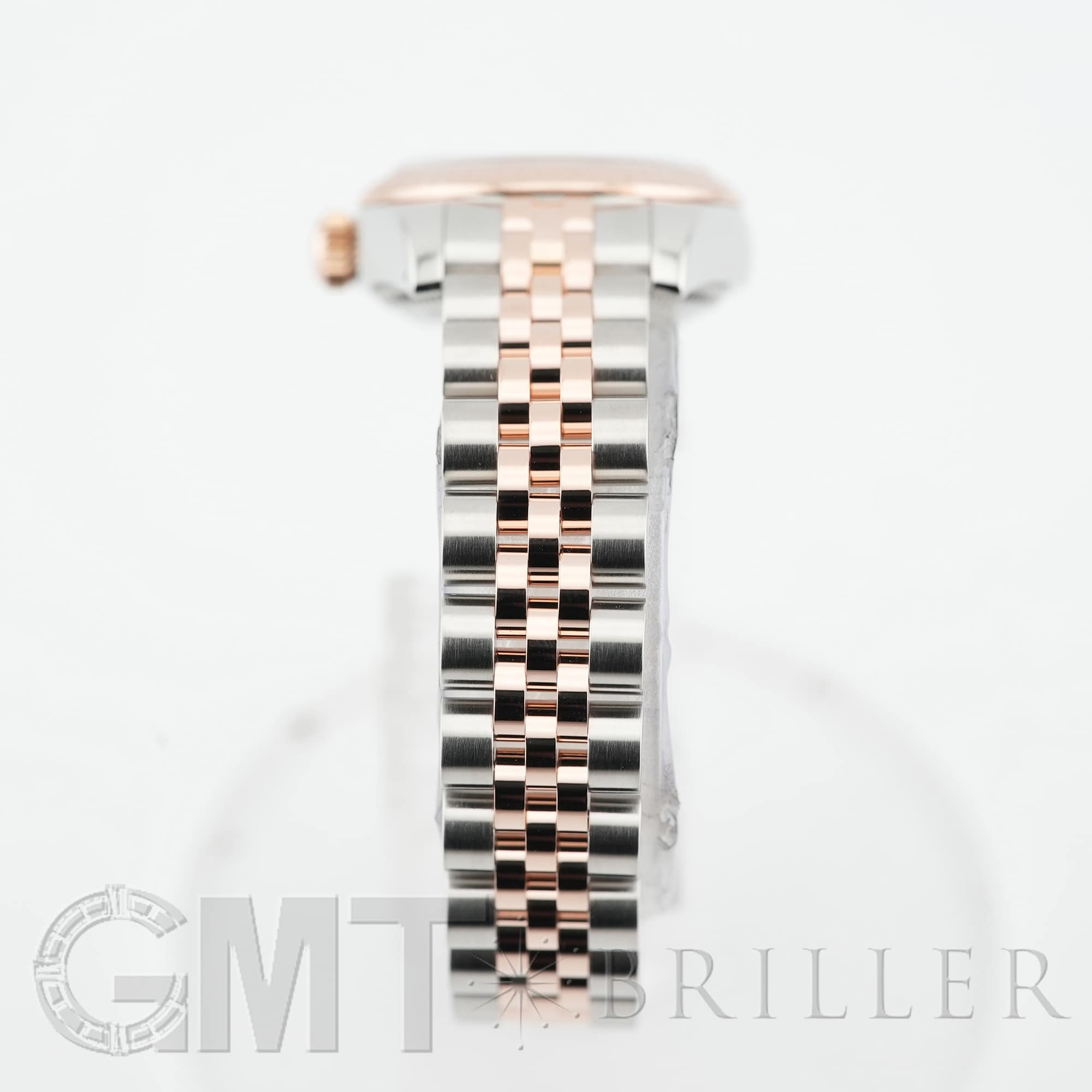 生産が終了しているケースサイズ26mmのデイトジャスト 179171です。現行のデザインよりも一回り小さなサイズ感はジュエリーライクな印象が強く、今でも人気が衰えません。また、サンダストともロゼともまた違ったオレンジがかった淡いピンクの文字盤色も、現在は見られないのでより特別感があります。「VI」だけにさりげなくセットされたダイヤモンドが可憐に手元を輝かせます。