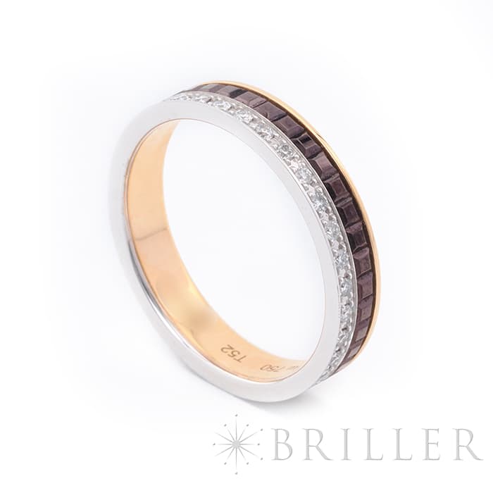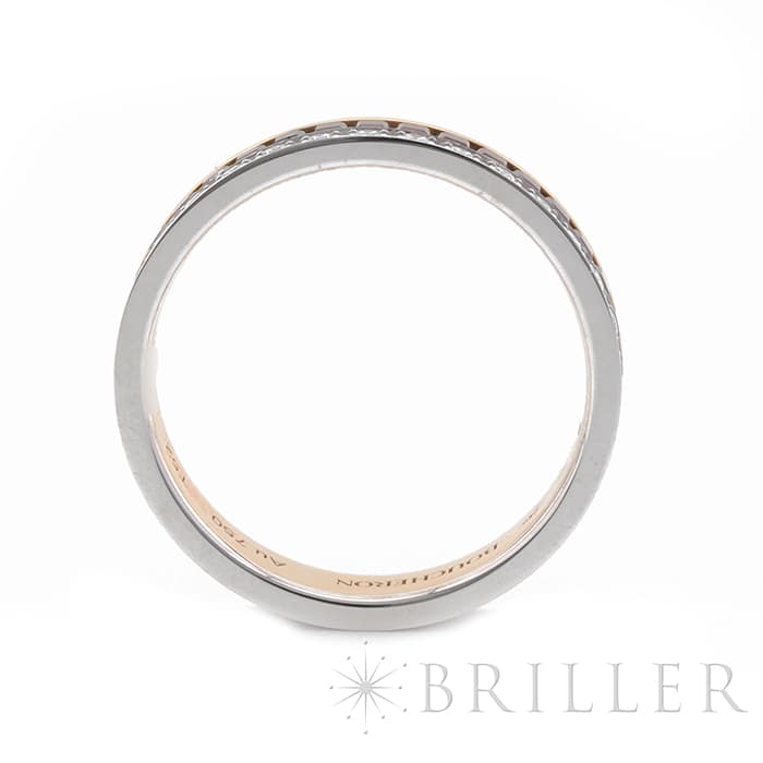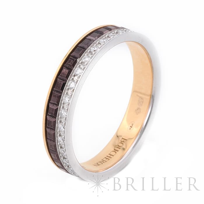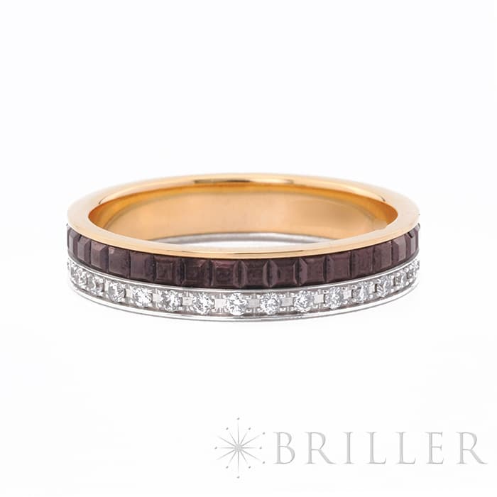 2004年に誕生したブシュロンのアイコン「キャトル」コレクション。こちらは、キャトル クラシック ダイヤモンド リングのハーフモデルです。ピンクゴールドのやわらかな色調をベースに、ダイヤモンドの煌めくラインと、ブラウンPVDのクル ド パリを組み合わせ、印象的なコントラストを描き出しています。程よいボリューム感がありながらも手元に自然となじみ、一本使いはもちろん重ね着けにも大変おすすめの商品です。