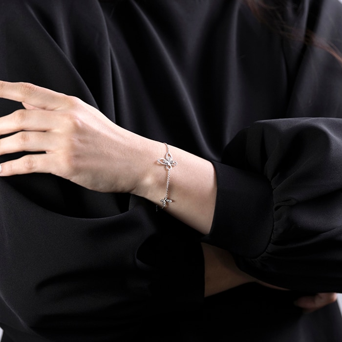 GRAFFを象徴する「バタフライ」コレクション。神話の時代から“再生・自由・美しさ”を象徴するバタフライをモチーフに、パヴェダイヤモンドで繊細なシルエットを描いた優美なデザインです。中央のミニバタフライに加え、サイドで舞う2匹の小さなバタフライが手元に華やかな輝きを添えます。軽やかなチェーンと繊細なダイヤモンドの煌めきが調和し、フェミニンで上品な存在感を演出。日常から特別なシーンまで美しく彩るジュエリーです。