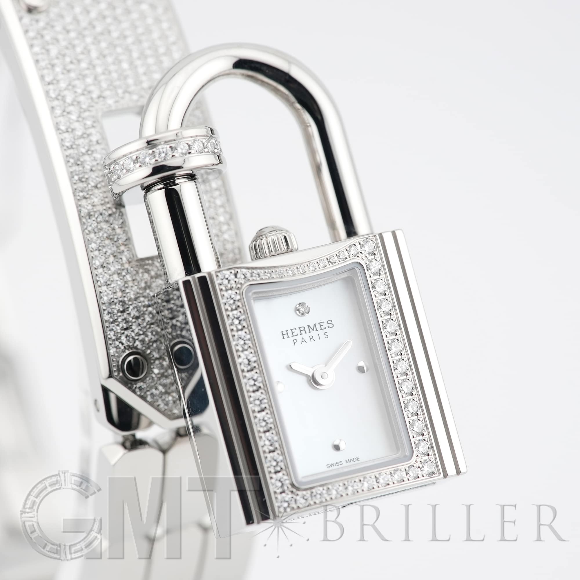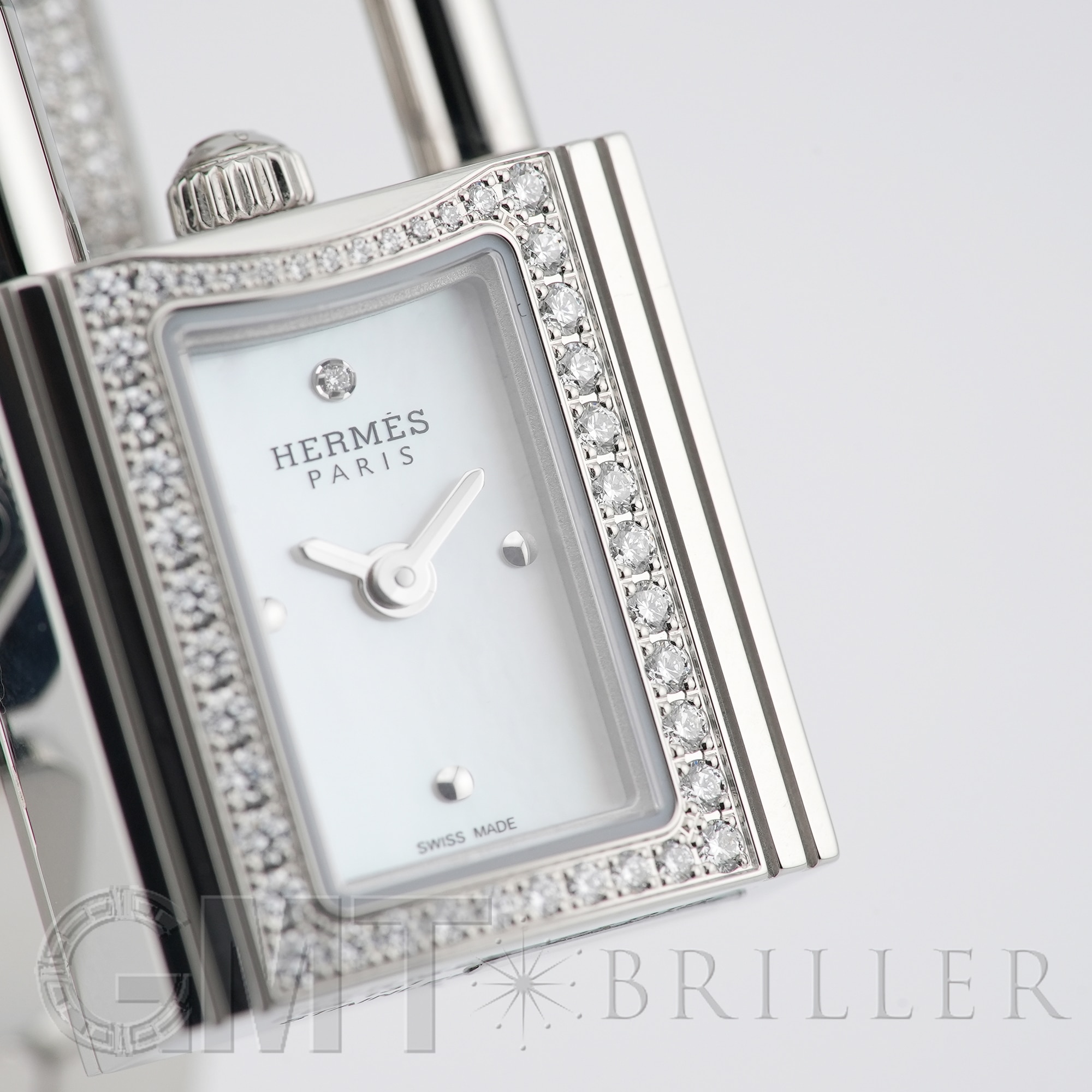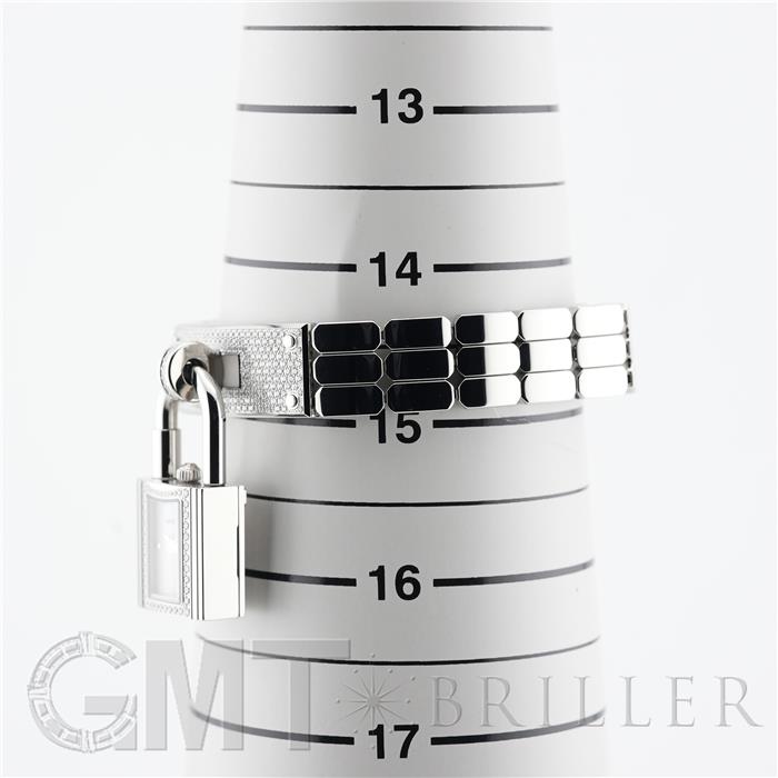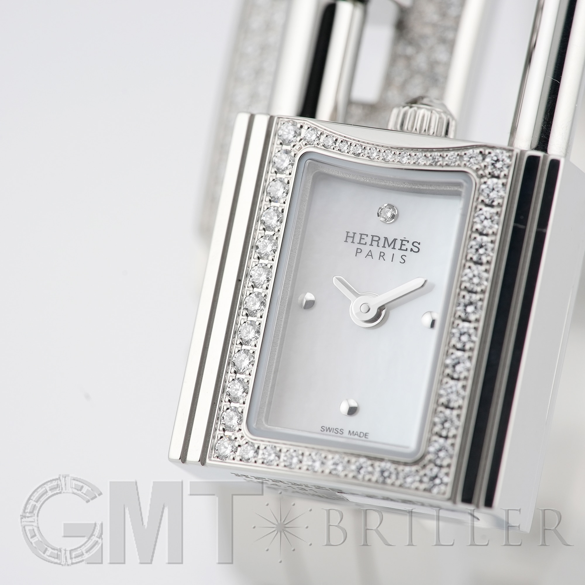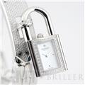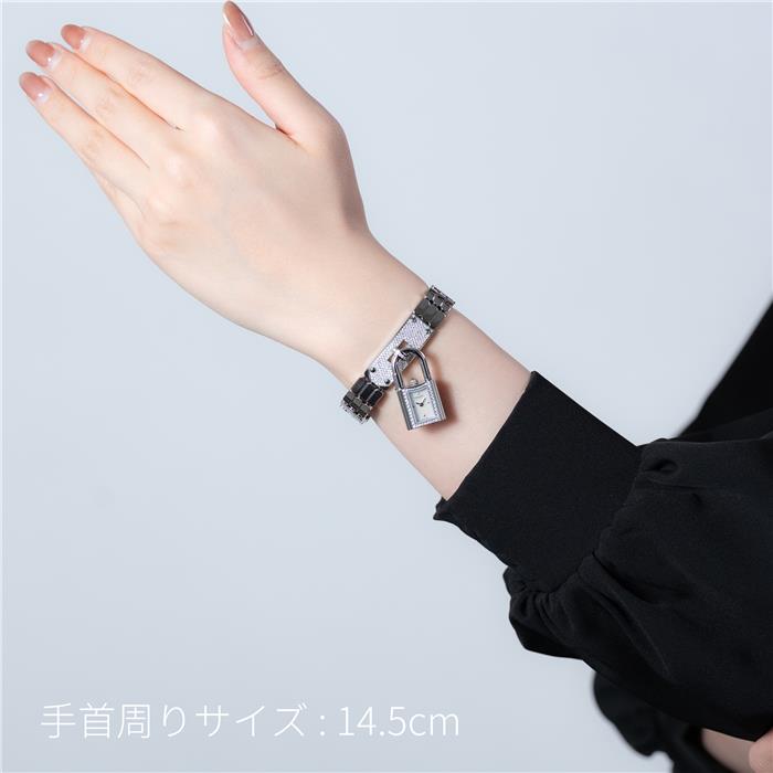 エルメス ケリーウォッチ ホワイトシェル ダイヤモンド KE4.131 HERMESエルメスを象徴する「ケリーバッグ」のカデナ(南京錠)をモチーフにした、まるでジュエリーのような佇まいのケリーウォッチ。立体的に造形されたカデナケースが手元で揺れ、装いにさりげない華やぎを添えます。こちらはステンレススティール製ブレスレットを採用したモデルで、しなやかな着け心地と上品な輝きを両立。ホワイトシェルダイヤルの柔らかな光沢に、ダイヤモンドをあしらったベゼルが気品ある煌めきを演出します。シャックル部分は取り外し可能で、エルメスらしい遊び心も魅力。時計でありながら、アクセサリー感覚で楽しめるエレガントな一本です。保証書日付 2025年7月中古のお品物ではございますが、ご着用時に気になる傷はございません。当社の中古品はインターネットでも安心してご購入頂けるよう、しっかりとした点検整備を行っております。エルメス 買取り・下取りも行っておりますので、お気軽にご相談ください。