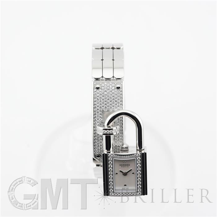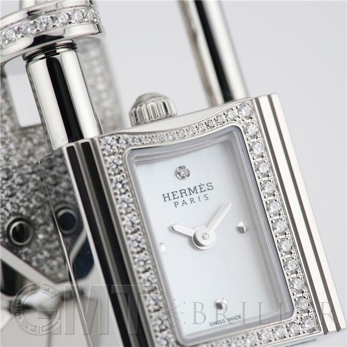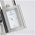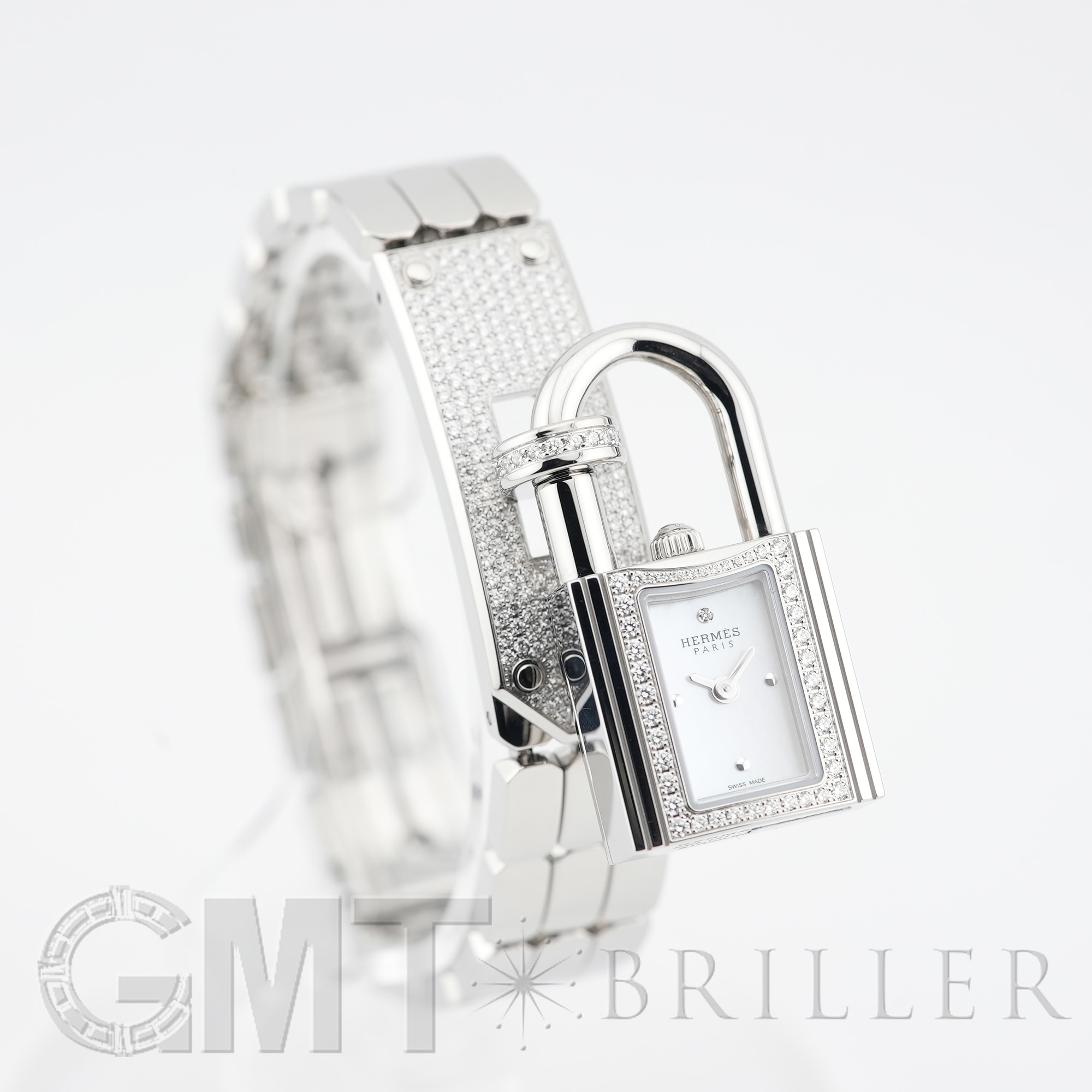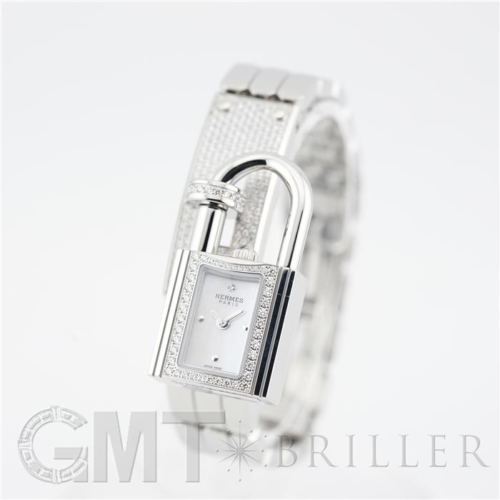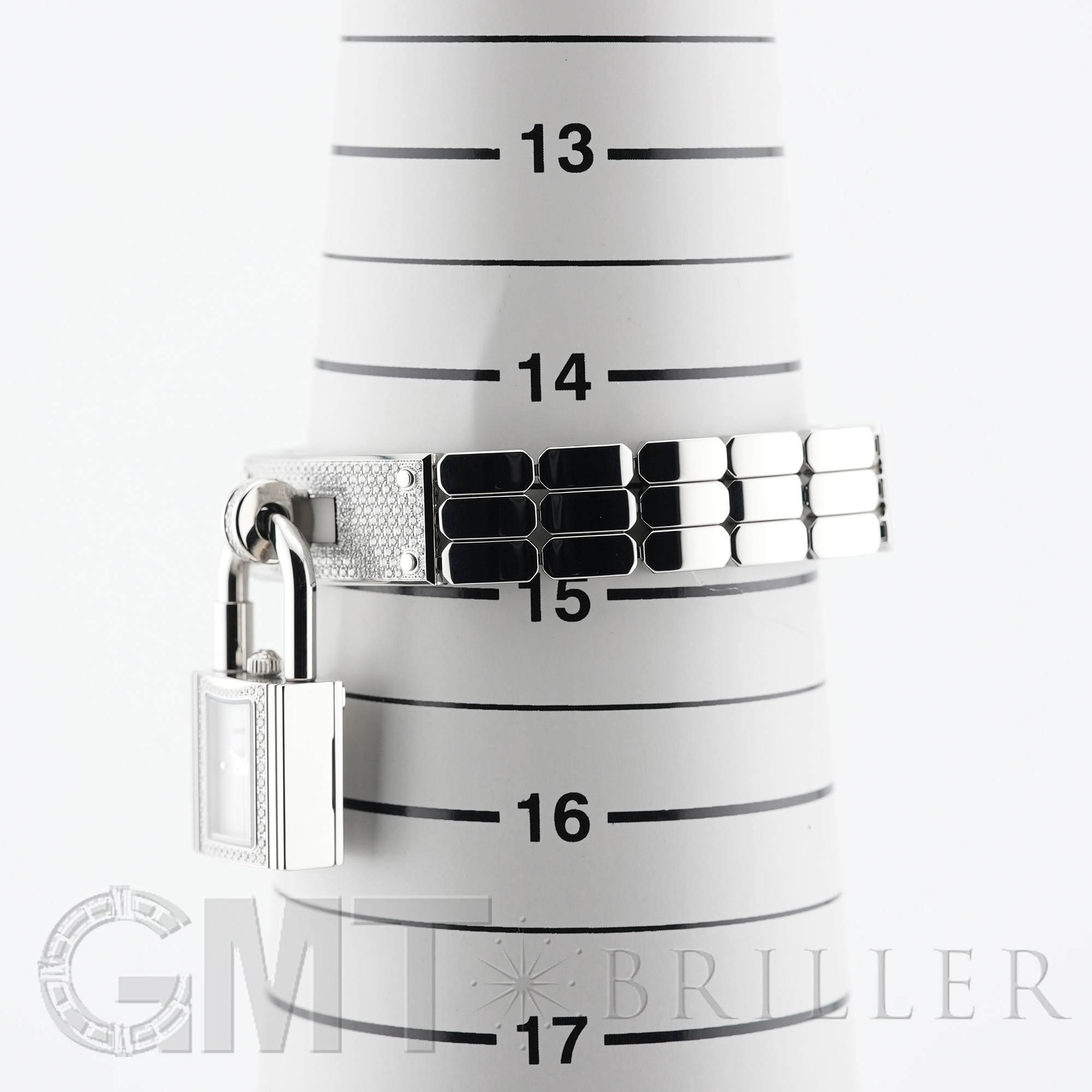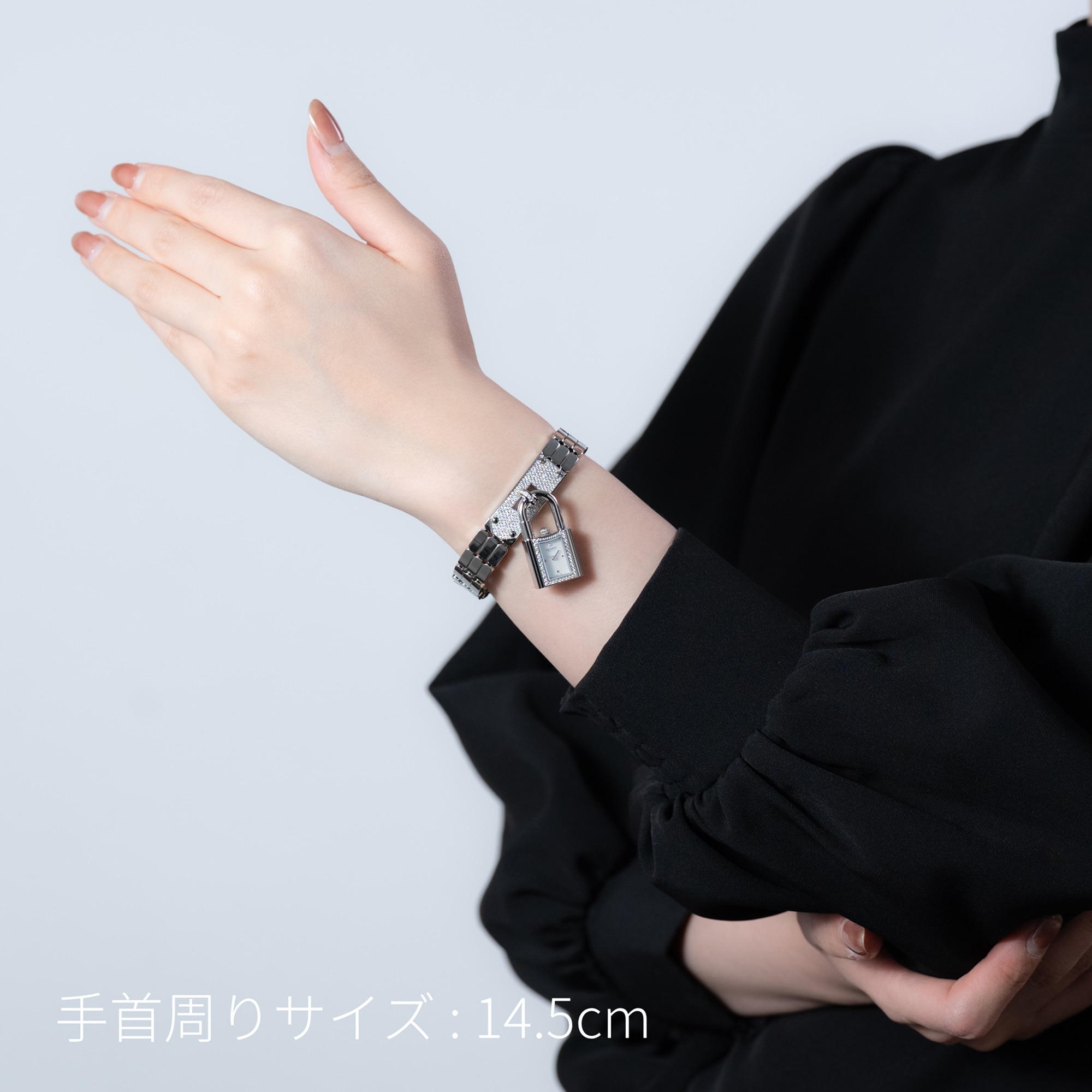 エルメス ケリーウォッチ ホワイトシェル ダイヤモンド KE4.131 HERMESエルメスを象徴する「ケリーバッグ」のカデナ(南京錠)をモチーフにした、まるでジュエリーのような佇まいのケリーウォッチ。立体的に造形されたカデナケースが手元で揺れ、装いにさりげない華やぎを添えます。こちらはステンレススティール製ブレスレットを採用したモデルで、しなやかな着け心地と上品な輝きを両立。ホワイトシェルダイヤルの柔らかな光沢に、ダイヤモンドをあしらったベゼルが気品ある煌めきを演出します。シャックル部分は取り外し可能で、エルメスらしい遊び心も魅力。時計でありながら、アクセサリー感覚で楽しめるエレガントな一本です。保証書日付 2025年7月中古のお品物ではございますが、ご着用時に気になる傷はございません。当社の中古品はインターネットでも安心してご購入頂けるよう、しっかりとした点検整備を行っております。エルメス 買取り・下取りも行っておりますので、お気軽にご相談ください。