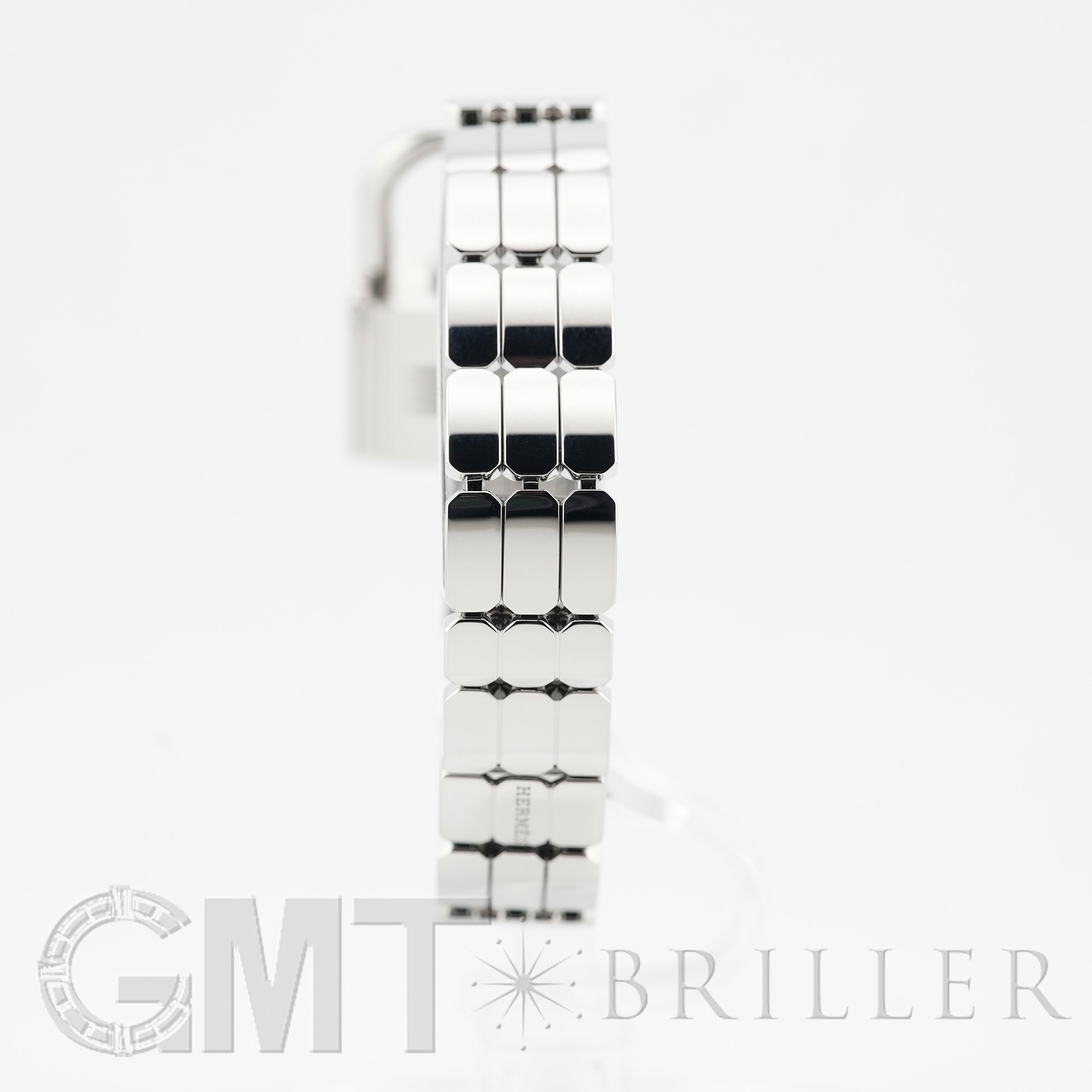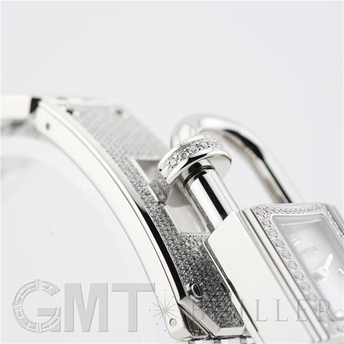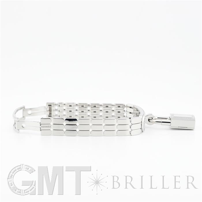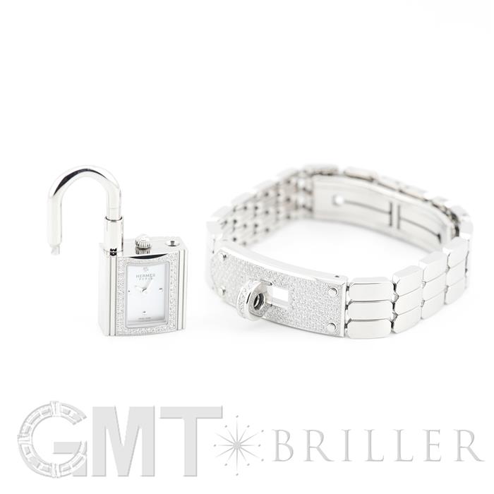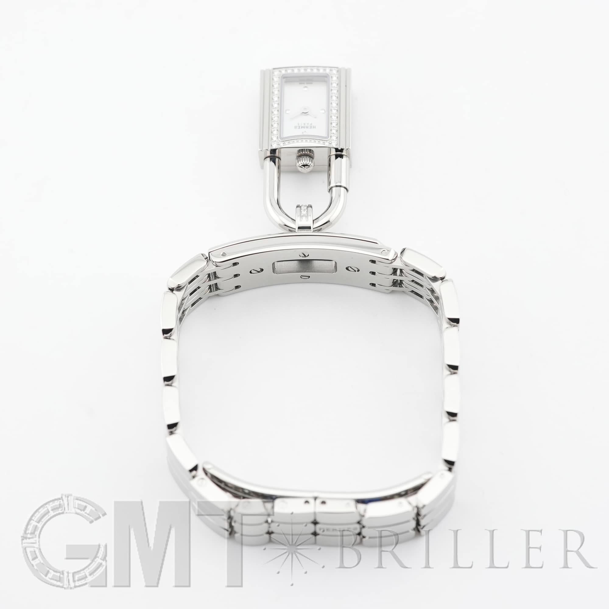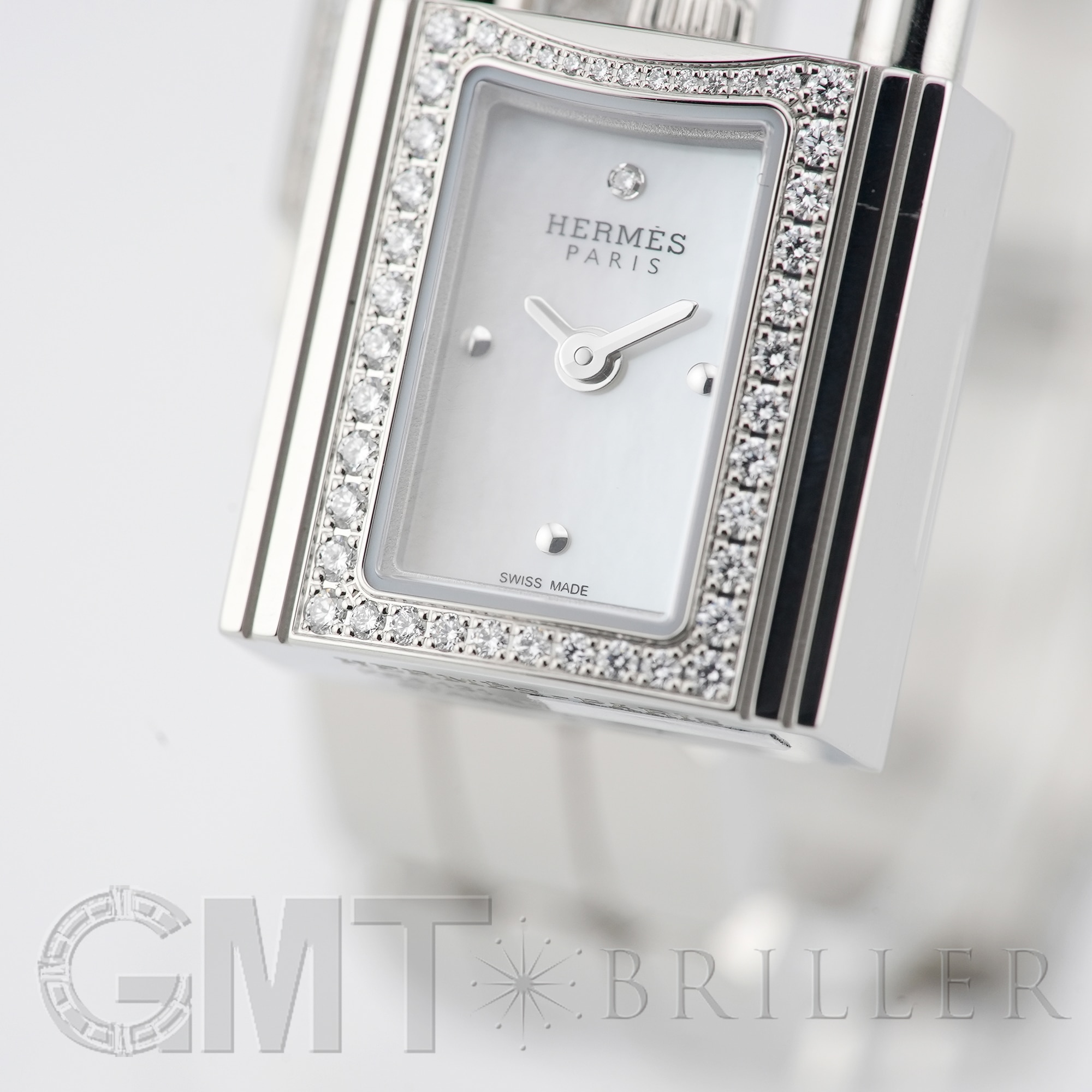 エルメス ケリーウォッチ ホワイトシェル ダイヤモンド KE4.131 HERMESエルメスを象徴する「ケリーバッグ」のカデナ(南京錠)をモチーフにした、まるでジュエリーのような佇まいのケリーウォッチ。立体的に造形されたカデナケースが手元で揺れ、装いにさりげない華やぎを添えます。こちらはステンレススティール製ブレスレットを採用したモデルで、しなやかな着け心地と上品な輝きを両立。ホワイトシェルダイヤルの柔らかな光沢に、ダイヤモンドをあしらったベゼルが気品ある煌めきを演出します。シャックル部分は取り外し可能で、エルメスらしい遊び心も魅力。時計でありながら、アクセサリー感覚で楽しめるエレガントな一本です。保証書日付 2025年7月中古のお品物ではございますが、ご着用時に気になる傷はございません。当社の中古品はインターネットでも安心してご購入頂けるよう、しっかりとした点検整備を行っております。エルメス 買取り・下取りも行っておりますので、お気軽にご相談ください。