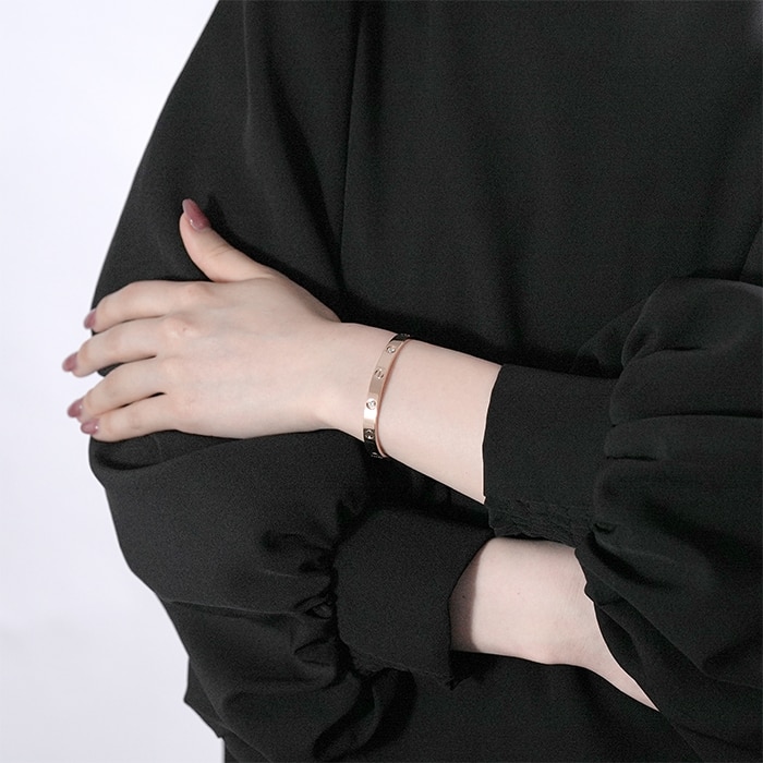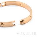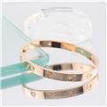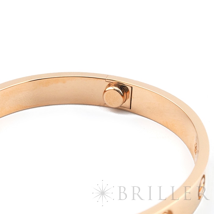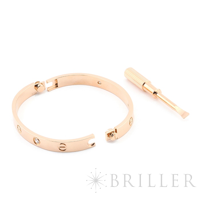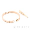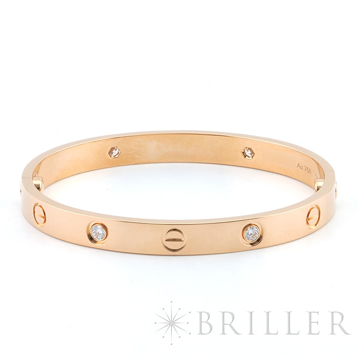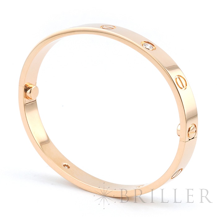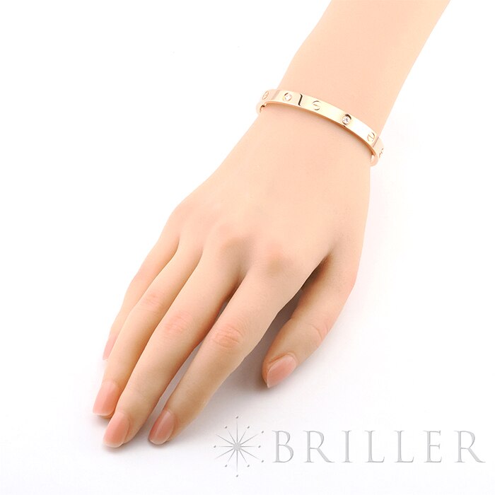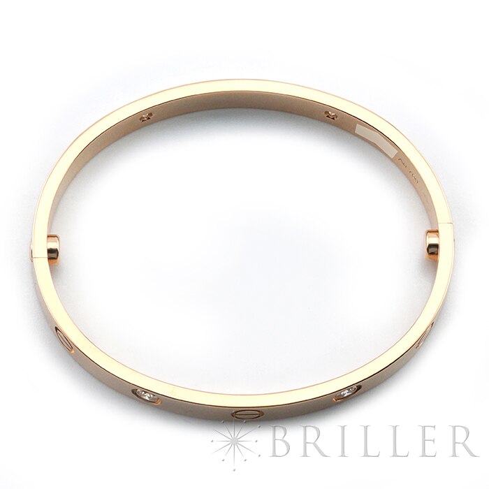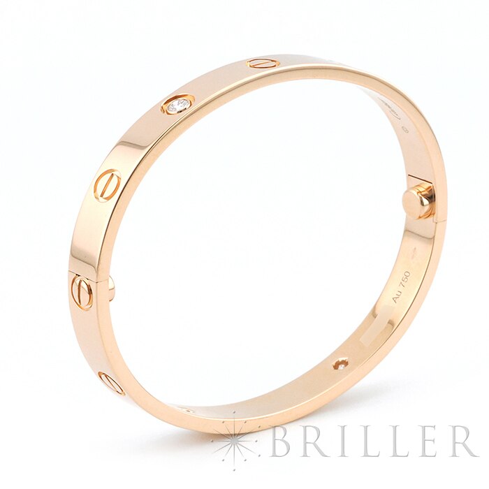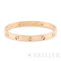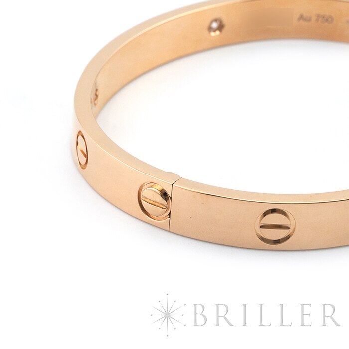 カルティエ ラブ ブレスレット クラシックモデル ダイヤモンド 4石 ピンクゴールド 16号 Cartierカルティエを代表する「LOVE」コレクション。1970年代にニューヨークで誕生し、愛の絆を象徴するデザインとして世界中で支持されています。本モデルは肌なじみの良いピンクゴールドに、ビスモチーフの代わりにブリリアントカットダイヤモンドを贅沢にセッティング。手元で上質な輝きを放ち、1本でも確かな存在感を演出します。シンプルなバングル型で、ほかのアイテムとの重ね付けにも最適です。日常から特別な日まで活躍する、人気アイテムです。証明書日付 2023年1月2024年3月 カルティエにて磨き済み中古のお品物ではございますが、ご着用時に気になるような傷はございません。。