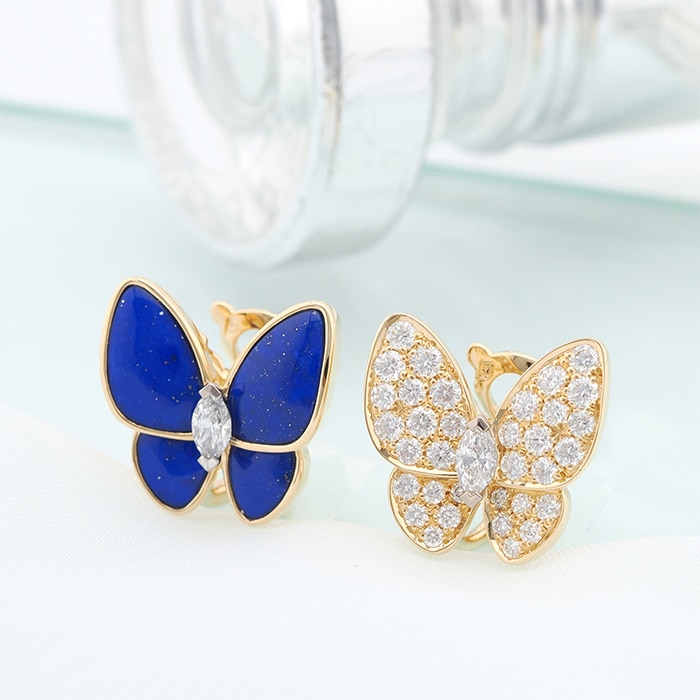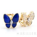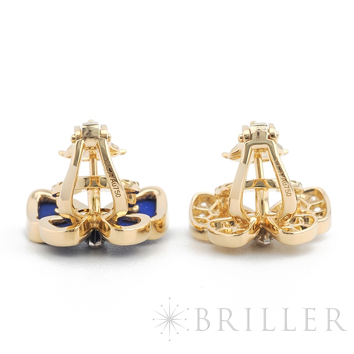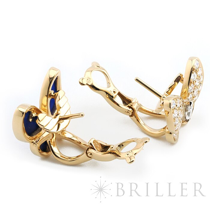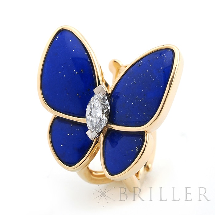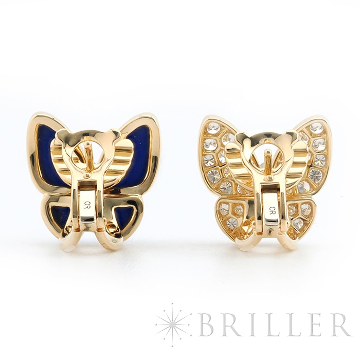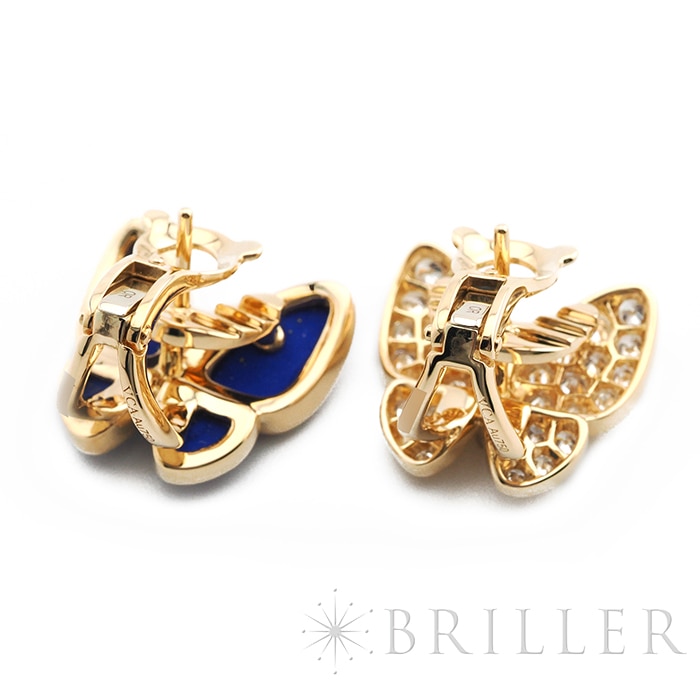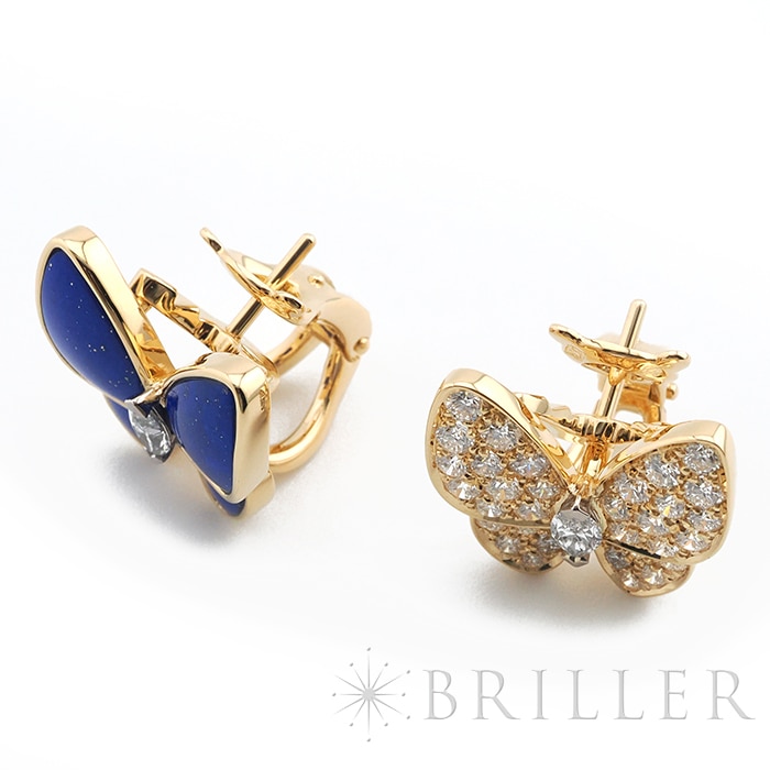 ヴァン クリーフ&アーペル ドゥ パピヨン イヤリング ピアス イエローゴールド ラピスラズリ ダイヤモンド VCARP3DO00 Van Cleef & Arpelsフランスに本店のある宝石、時計、香水を扱うハイジュエラー「ヴァンクリーフ&アーペル」1906年に誕生し、数多くのセレブリティから愛されているブランドとなります。本作は、メゾンを象徴するモチーフのひとつである蝶を優美に表現した「ドゥ パピヨン」イヤリング。左右で異なる表情を楽しめるアシンメトリーなデザインが特徴で、片方には深いブルーが美しいラピスラズリ、もう片方には繊細な輝きを放つダイヤモンドをセッティングしています。素材には温かみのあるイエローゴールドを採用し、全体にエレガントな統一感をもたらします。自然の美しさと詩情を感じさせるデザインは、装いに優雅なアクセントをプラスし、存在感がありながらも上品にまとまり、日常から華やかなシーンまで幅広く活躍します。ヴァン クリーフ&アーペルならではの世界観を堪能できる、洗練されたジュエリーです。証明書日付 2021年9月中古商品となりますため微細な傷がございますが、着用時に目立つものではありません。