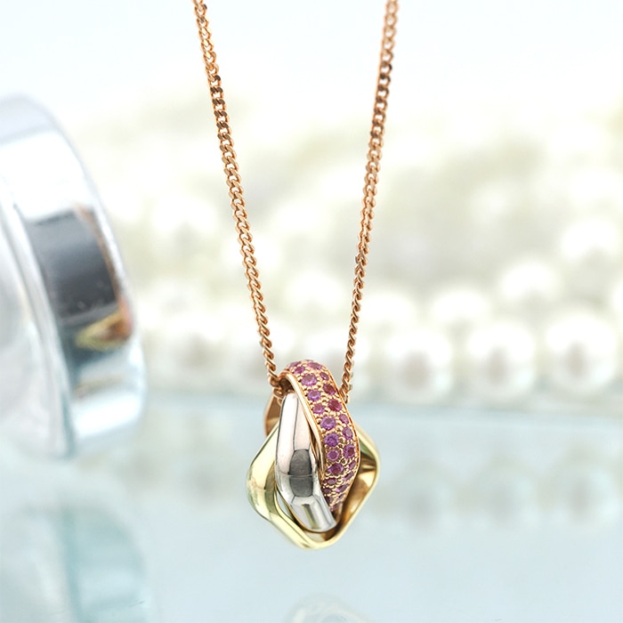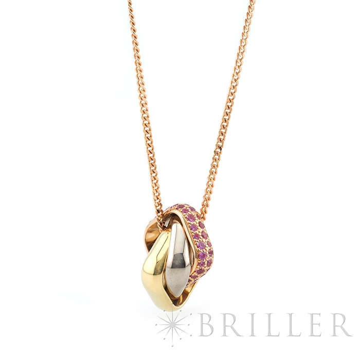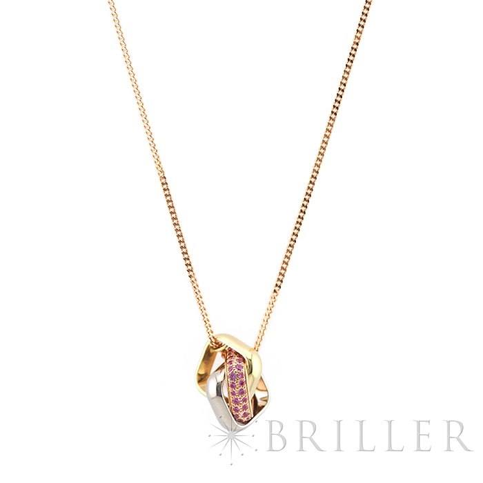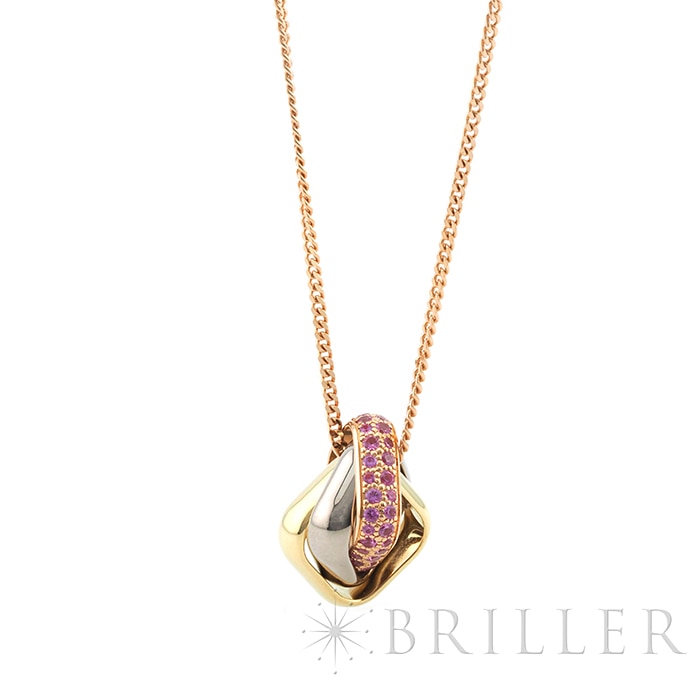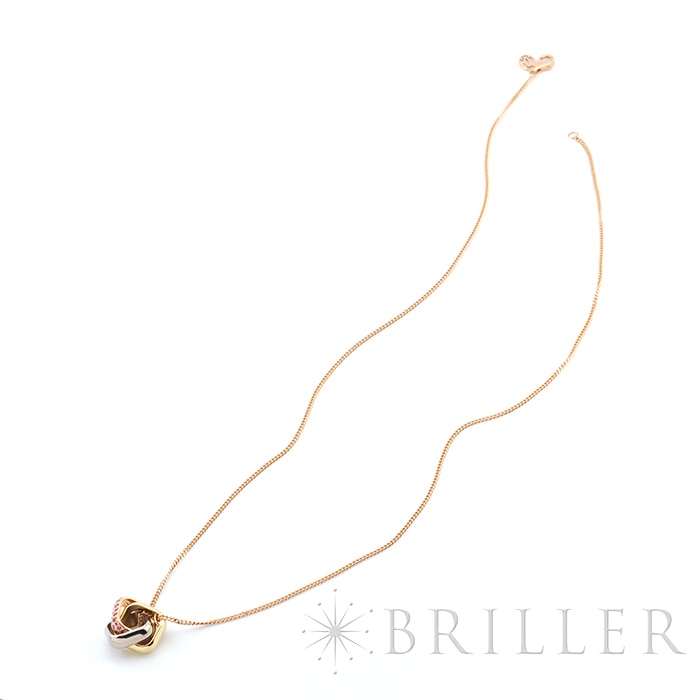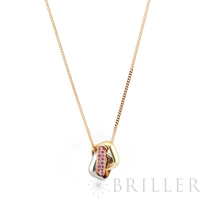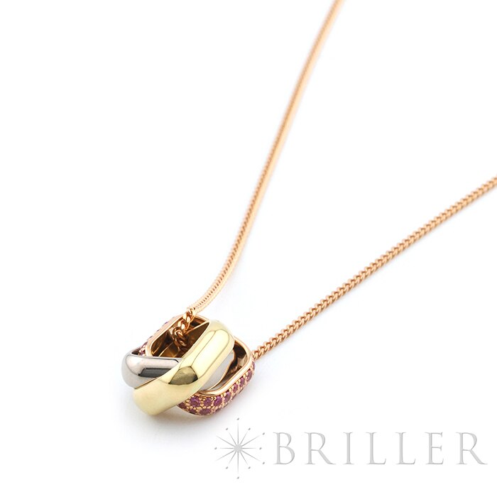 カルティエ トリニティ クッション ネックレス ピンクサファイア イエローゴールド ピンクゴールド ホワイトゴールド Cartierカルティエを象徴する「トリニティ」クッション ネックレス。ホワイト・イエロー・ピンクの3色ゴールドが織りなす優美なフォルムに、鮮やかなピンクサファイアをセッティングした華やかなモデルです。幾何学的なスクエアフォルムのクッションモチーフが胸元に洗練された存在感を添え、動くたびに繊細な輝きを放ちます。タイムレスなデザインにモードな彩りを加え、日常から特別なシーンまで幅広く活躍する一本です。証明書日付 2024年5月中古のお品物ではございますが、ご着用時に気になる傷はございません。