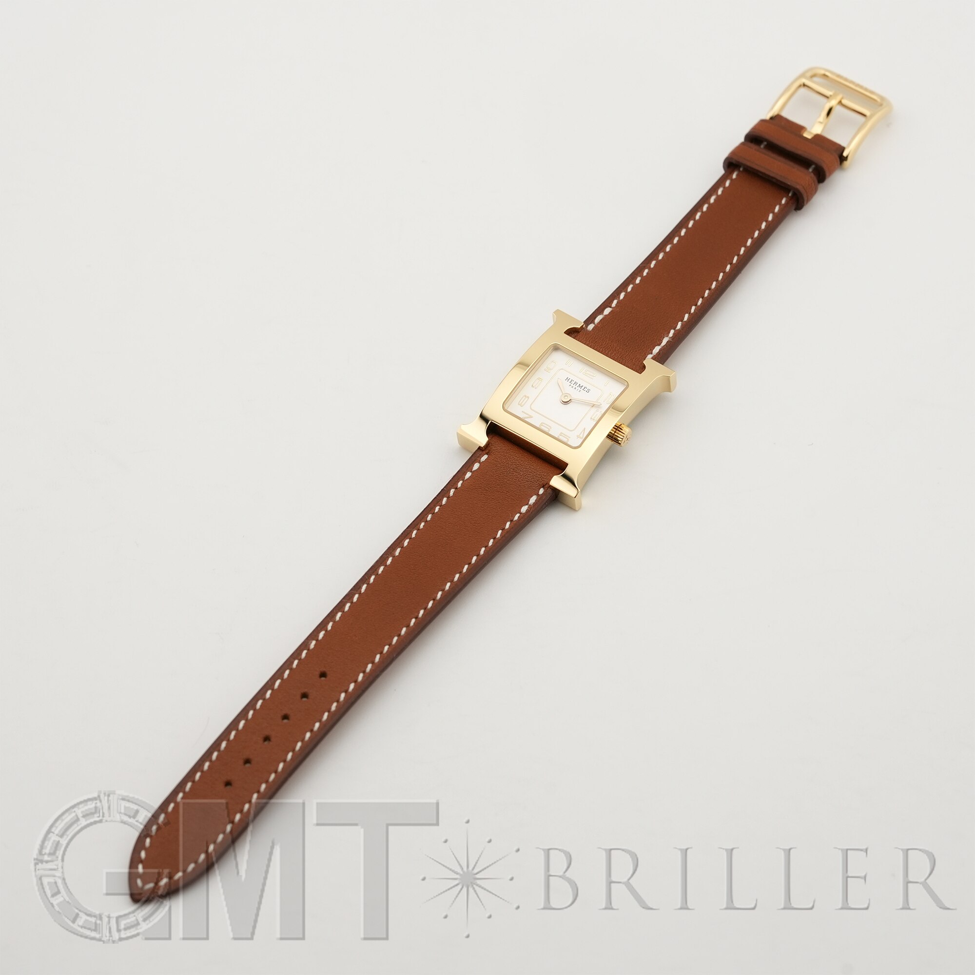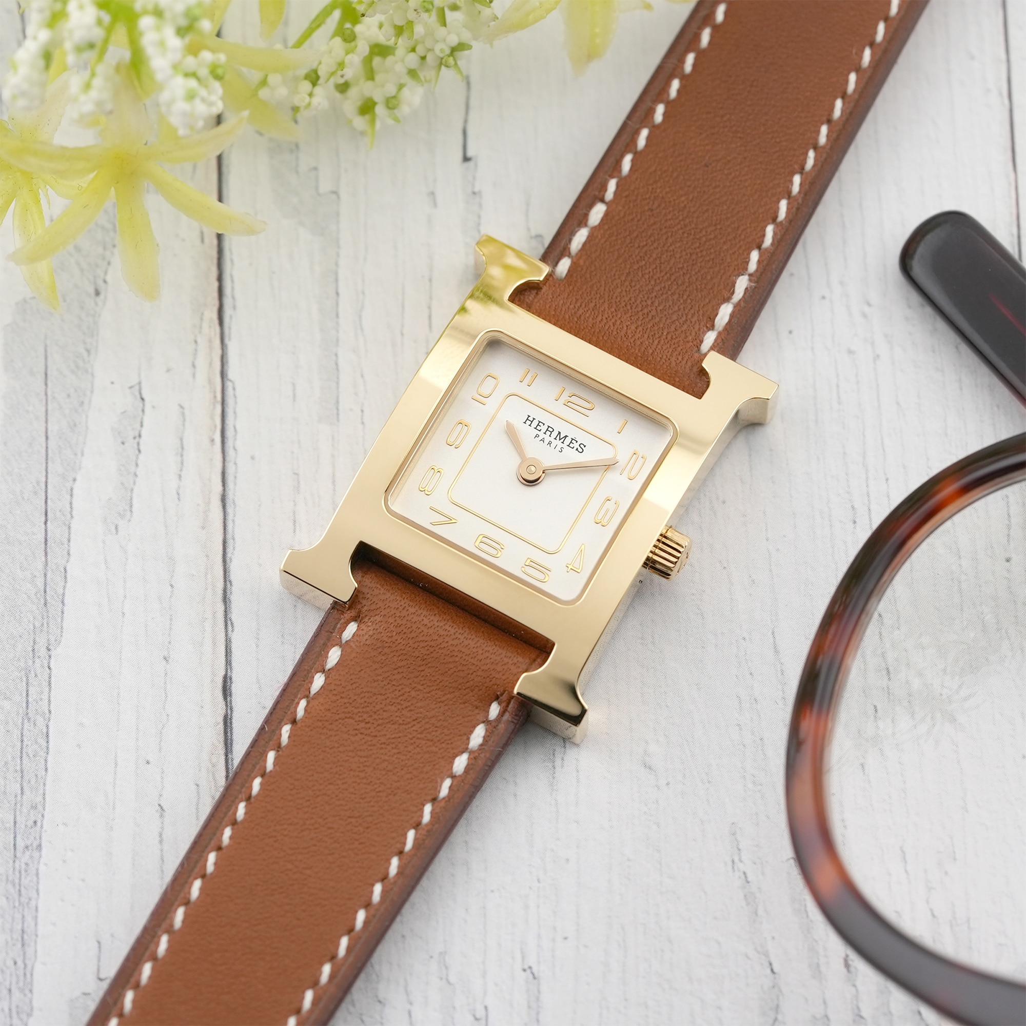 エルメス Hウォッチ PM ゴールド ゴールド金具 HH1.201 HERMES 1837年に高級馬具メーカーとして始まり、世界最高峰の革製品ブランドとして、世界中のセレブリティに愛され続けるエルメス。 1996年の誕生以来、ブランドの頭文字「H」をモチーフにした「Hウォッチ」は、エルメス時計の中でも人気を集めるアイコンウォッチです。 特徴的な「H」型のケースにシンプルな文字盤、そして世界が認めるエルメスの革職人によって製作される最上級のレザーストラップがこの時計の魅力となっています。 保証書日付 2026年1月 【未使用品】 ※コンディションにつきまして、展示や輸送の過程で生じたごくスレや細かい傷が見受けられる場合がございますが、 使用履歴のない「未使用」状態となります。 エルメス 時計の買取り・下取りも行っておりますので、お気軽にご相談ください。