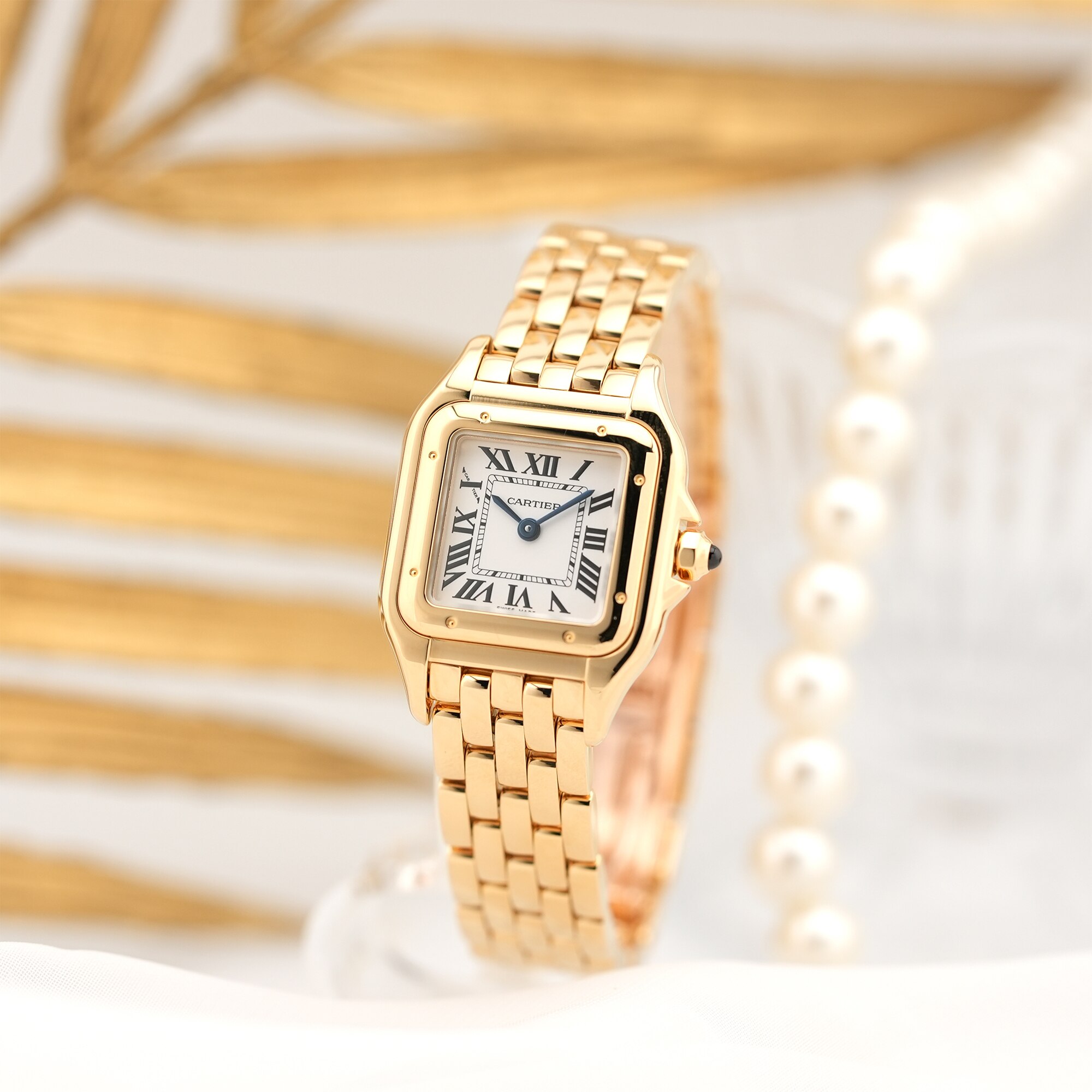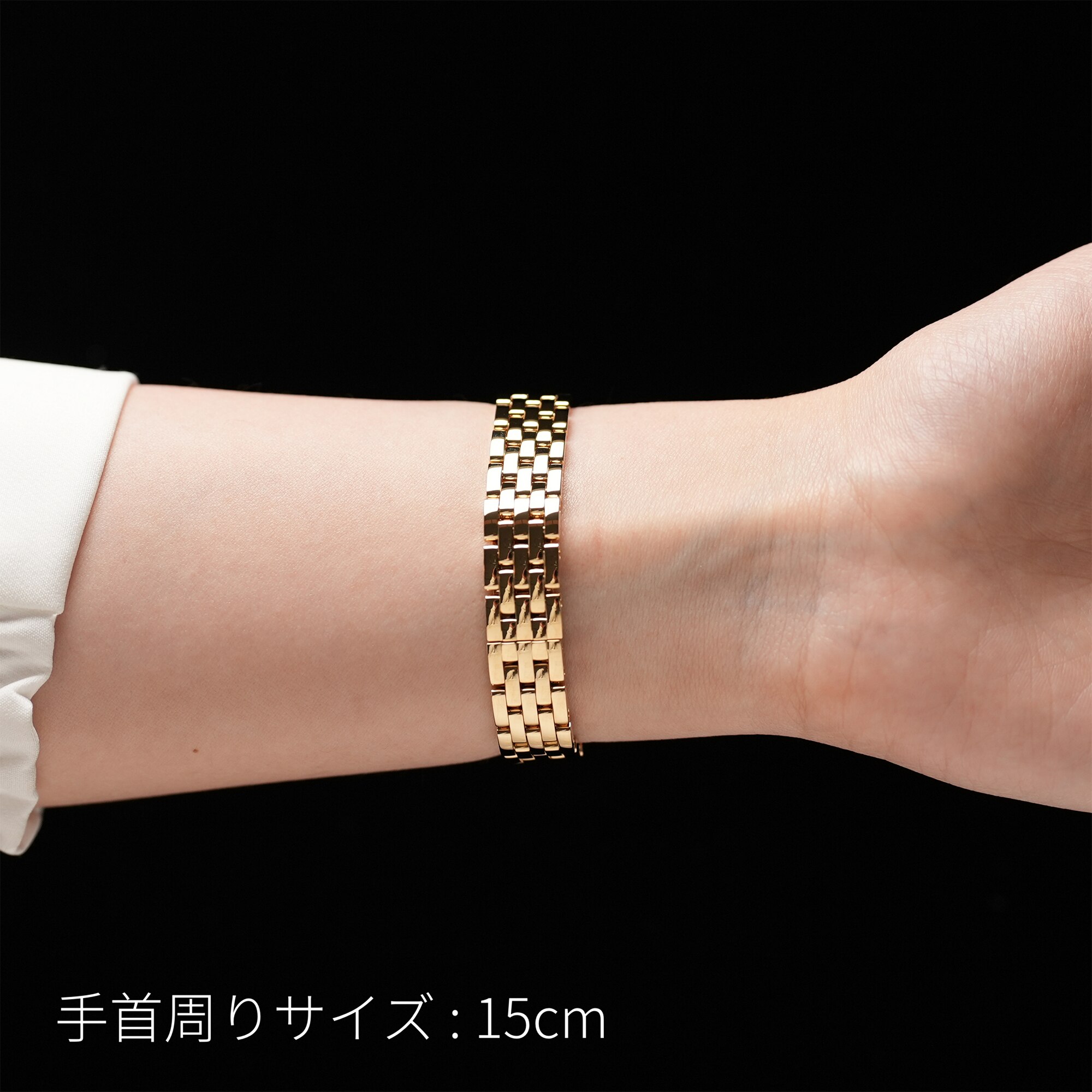 フランスを代表する名門ジュエラー Cartier が誇るアイコンウォッチ「パンテール ドゥ カルティエ」。1980年代に誕生し、ジュエリーウォッチの名作として世界中で高い人気を博してきたコレクションです。その名はフランス語で“豹”を意味し、ブランドの象徴としてジュエリーコレクションにも度々用いられてきました。本モデル「WGPN0047」は、優雅な輝きを放つイエローゴールドケースを採用したラグジュアリー仕様。端正なスクエアケースと、パンテールの象徴でもあるしなやかな5連ブレスレットが洗練された存在感を演出します。 滑らかに連なるリンクブレスレットは腕元に柔らかく沿い、ジュエリーのような快適な装着感を実現。コンパクトなSMサイズは、上品で女性らしいバランスを生み、手元を美しく彩ります。華やかなゴールドの輝きは肌馴染みが良く、日常からフォーマルシーンまで幅広く活躍。時代を超えて愛され続けるデザインは、カルティエならではの美意識を体現しています。時計でありながらジュエリーとしての価値も備えた、特別な魅力を持つタイムピース。エレガンスとステータスを兼ね備えた、コレクション性の高い一本です。