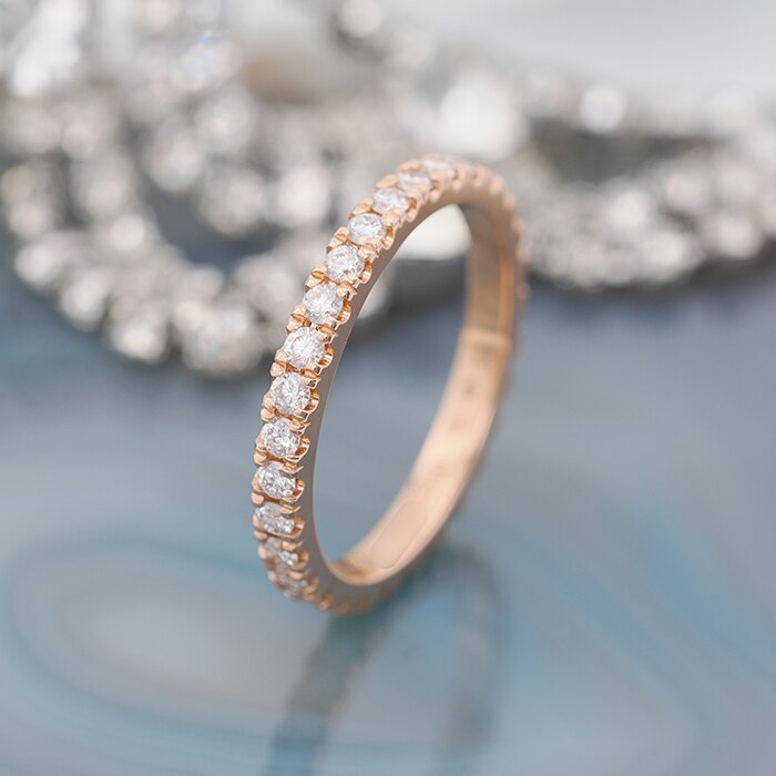 アルフレッド・ヴァン クリーフとエステル・アーペルの結婚から生まれたメゾン、「ヴァン クリーフ&アーペル」。こちらはフランス語で「至福」を意味する『フェリシテ エタニティリング』です。肌馴染みの良いローズゴールドにダイヤモンドが輝きます。細部にまで行き届いた職人技により、繊細なフォルムと完璧なセッティングが際立つ仕上がり。幅2.1mmの洗練されたデザインは単体ではもちろん、お手持ちのジュエリーとの重ね着けにもおすすめです。